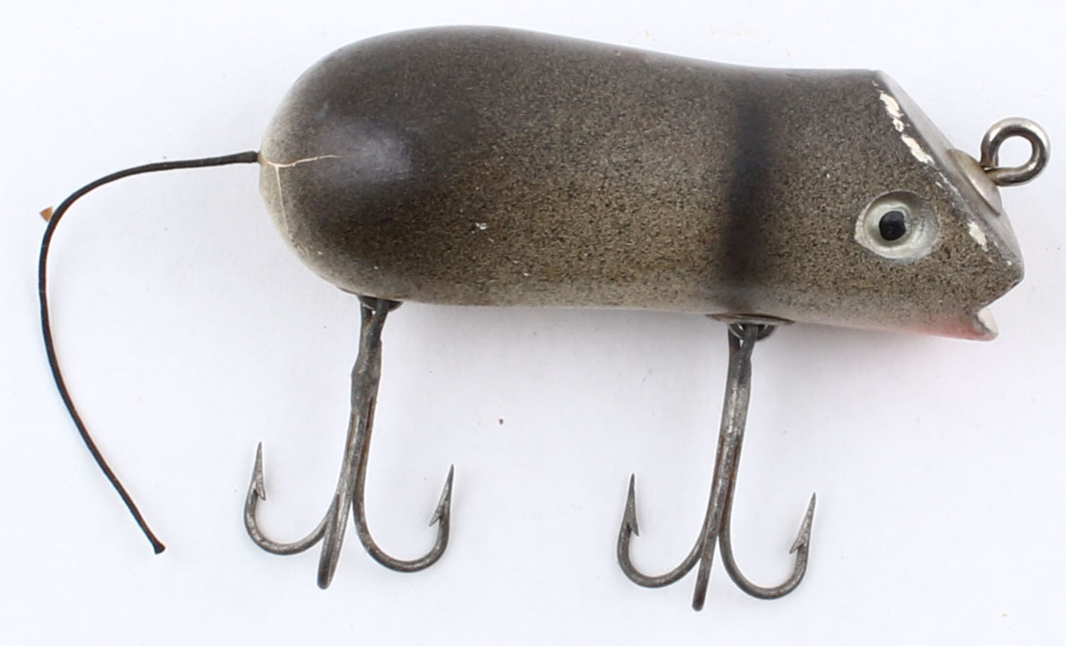Shakespeare Genuine Swimming Mouse, TE, gray, black, cream & red, 2 hooks, 3'' OAL. Grade: Very Good++ - Value: 10 to 50
