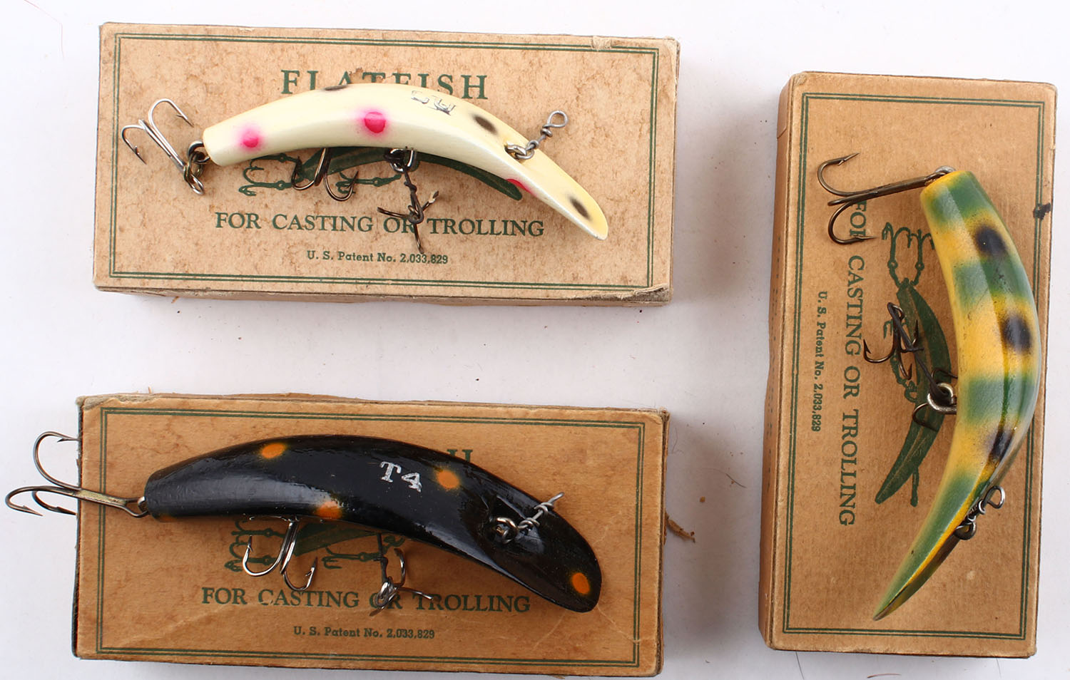 Lot of 3 Helin Tackle Co. Flat Fish, all different color patterns. Grade: Very Good - Value: 10 to 50