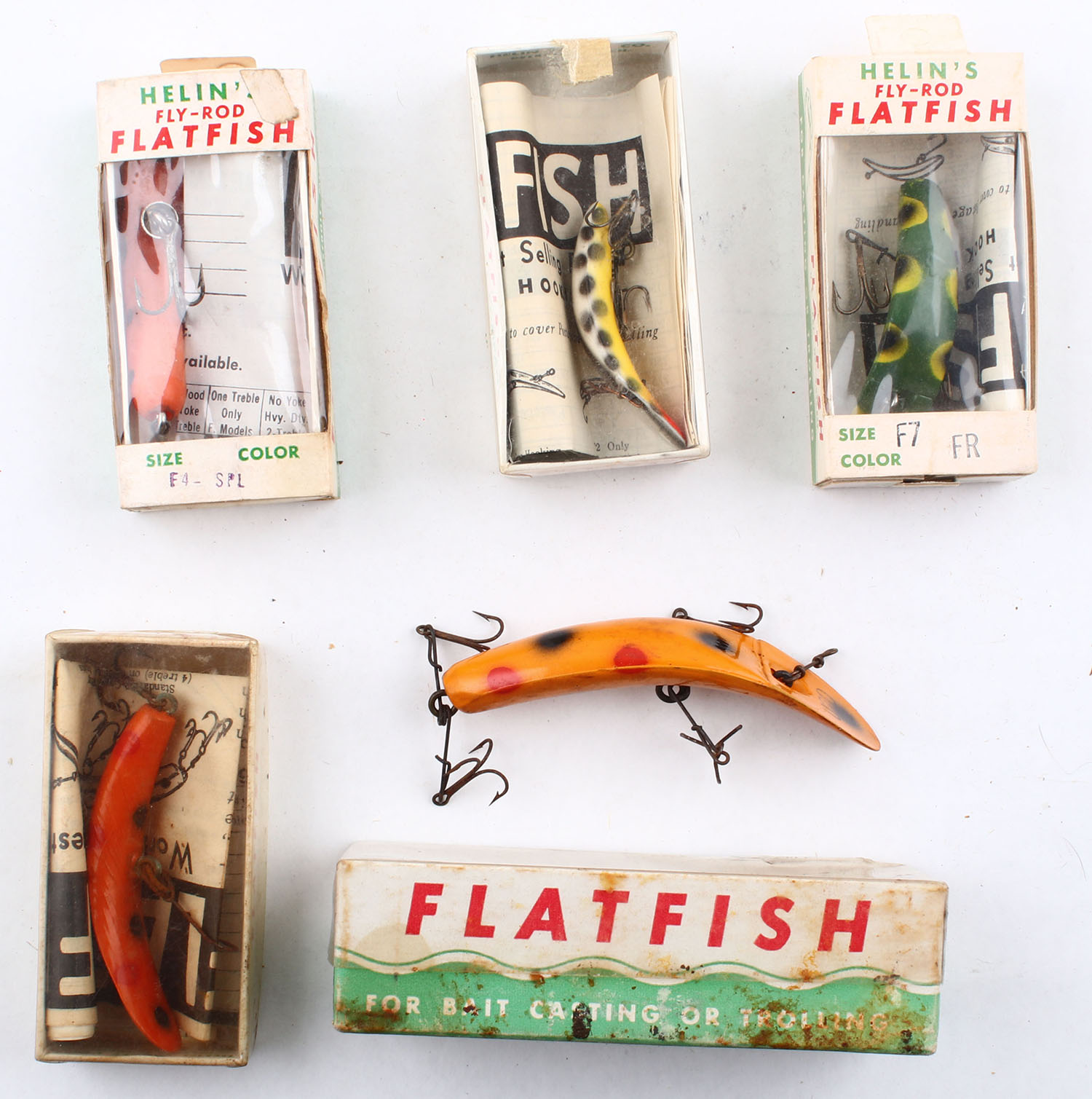 Lot of 5- Helin Flatfish, all different colors/patterns, all have boxes. Grade: Very Good ++ - Value: 10 to 50
