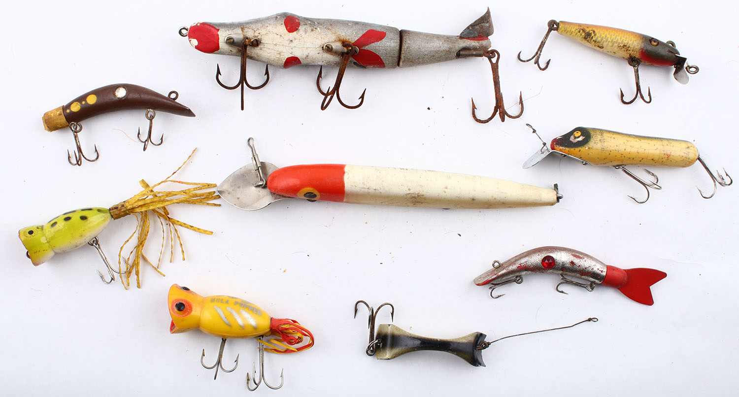 Lot of 9- mixed lures, all different colors/patterns/sizes. Grade: Very Good - Value: 10 to 50