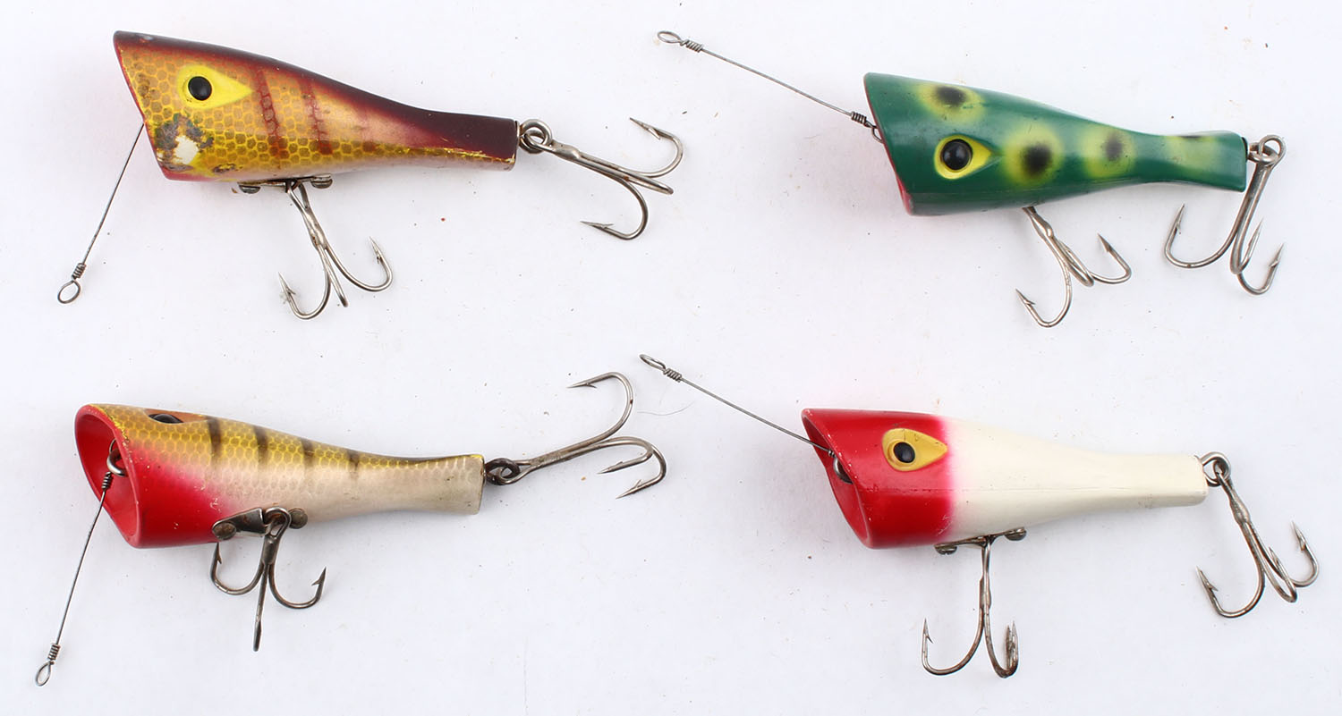 Lot of 4- topwater fishing lures, similar style, different colors surface rigs. Grade: Very Good+ - Value: 10 to 50