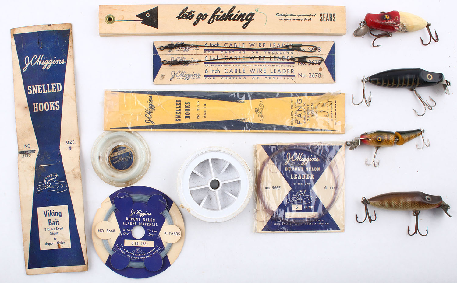 Large Lot of JC Higgins fishing tackle, includes lures, line, hooks, ruler & a couple other related items. Grade: Good++ - Value: 10 to 50
