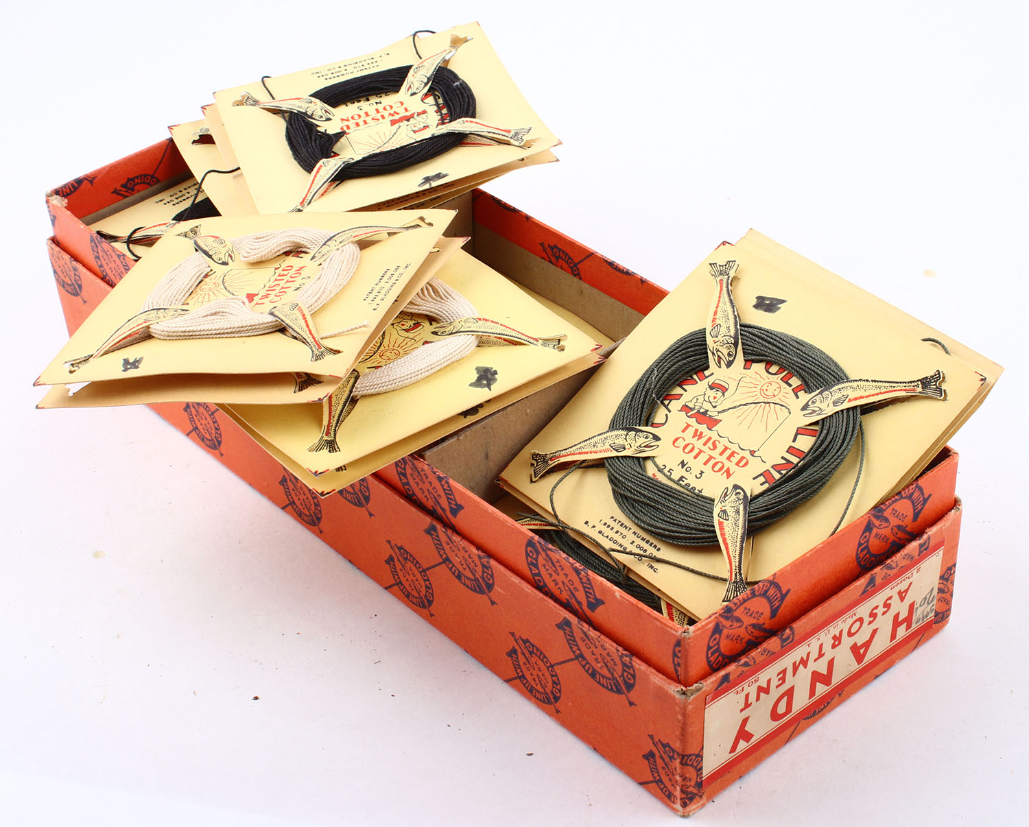 Box of Assorted Cane Pole Line. Appx 30 packages if line in 3 different colors, 25 ft strands. Grade: Excellent - Value: 8 to 30