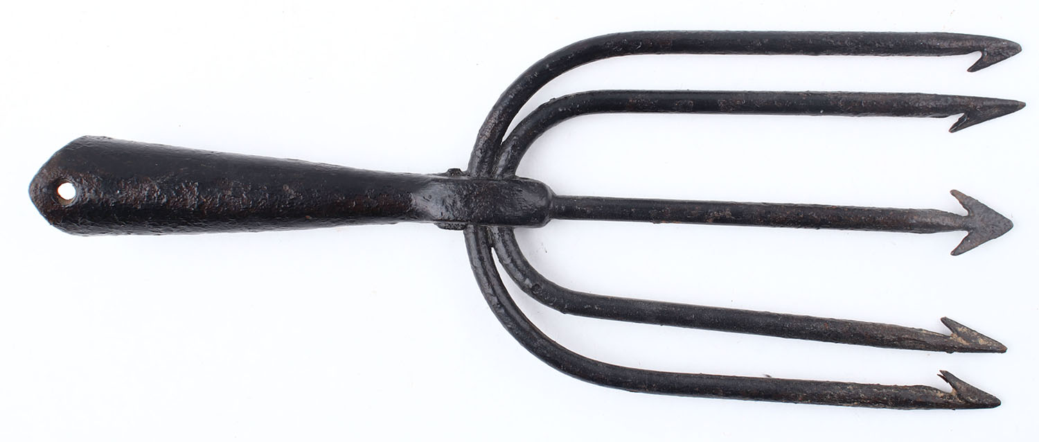 Vintage small fishing spear/gig, typically used for catching fish, eels or frogs in shallow water. 10 1/2'' OAL. Grade: Very Good - Value: 10 to 50