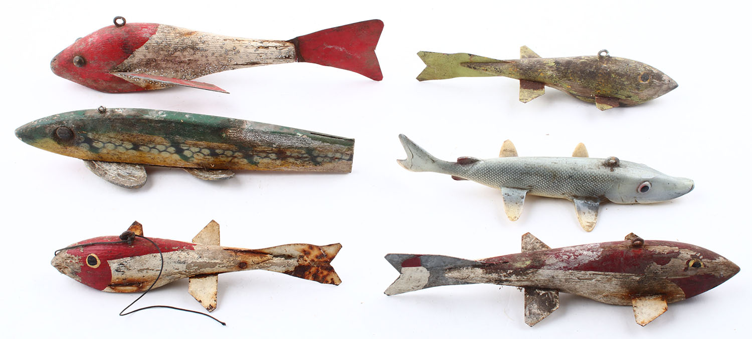 Lot of 6 Ice Fishing decoys, (5) wood & metal, (1) plastic, different color patterns/shapes/sizes. Grade: Good - Value: 20 to 60