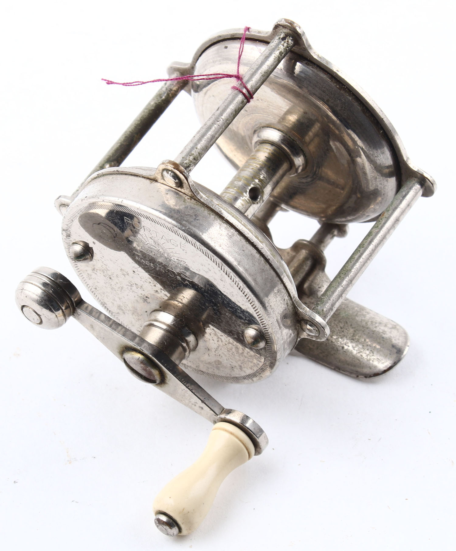 Atlas Portage, 60yd, single handle, marked on right side plate, turn is slightly stiff, some spotting & speckling throughout. Grade: Very Good - Value: 10 to 50