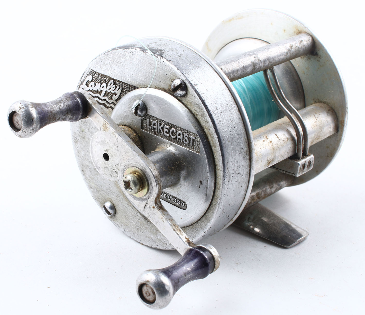 Cangley Lakecast Model 350, dual handle, marked on right side plate & bottom of reel seat, good click, smooth reel turn. Grade: Good++ - Value: 10 to 50