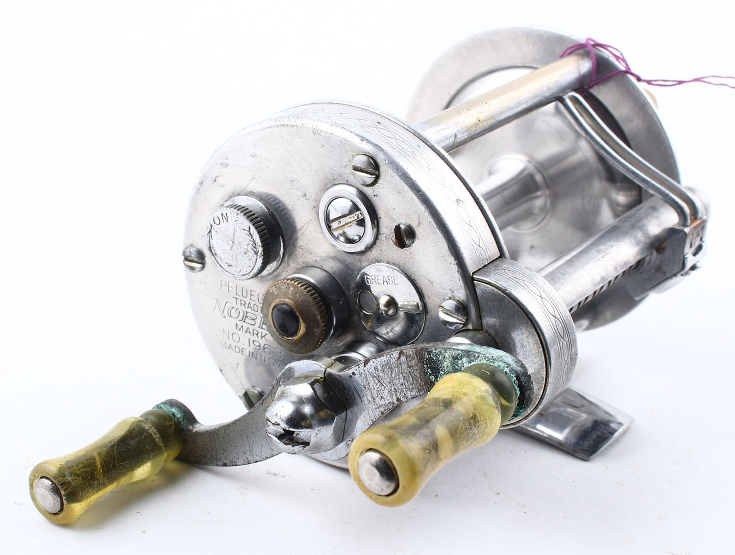Pflueger Nobby No. 1963, dual handle, JWL, marked on left/right side plate, smooth click & reel turn. Grade: Excellent - Value: 10 to 50