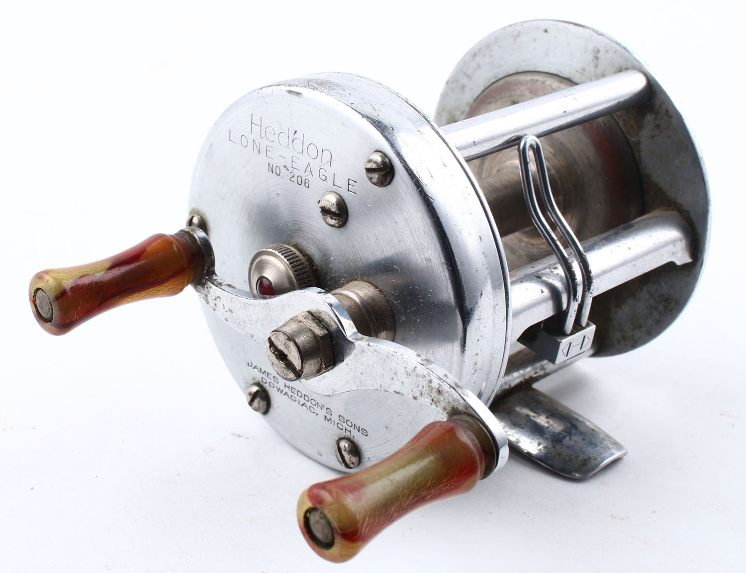 James Heddon's Sons, Heddon Lone-Eagle No. 206, dual handle, JWL, marked on right side plate & reel seat, strong click, smooth reel turn. Grade: Very Good+ - Value: 10 to 50