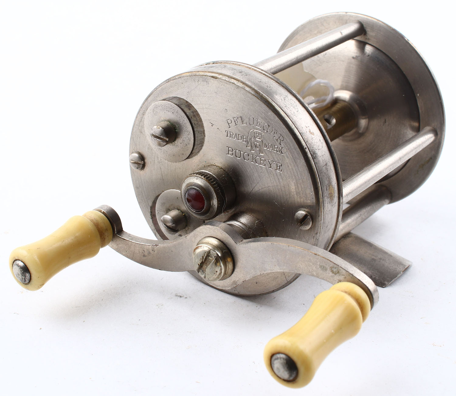 Pflueger Buckeye, Bulldog Logo, dual handle, 60yd, JWL, marked on the right side plate & bottom of reel seat, strong click, smooth reel turn. Grade: Excellent + - Value: 10 to 50