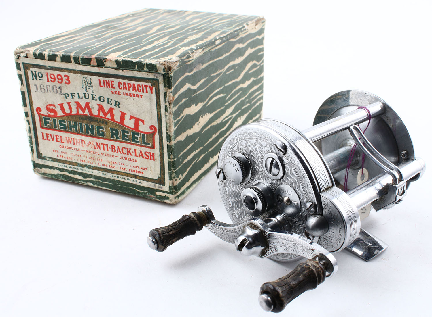 BOXED, Pflueger Summit No 1993, dual handle, marked on the small right side plate, strong click, smooth reel turn, comes in original box. Grade: Excellent - Value: 10 to 50