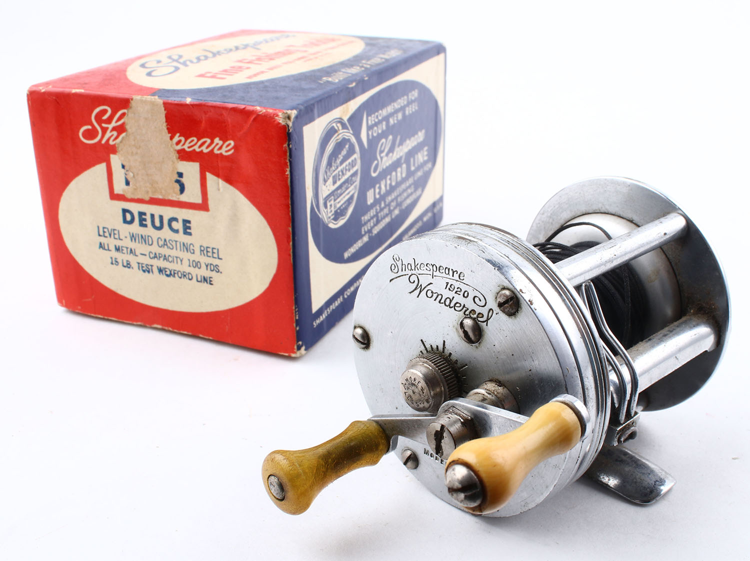 Shakespeare Wondereel 1920 Model GA, mismatched dual handle, marked on right side plate & bottom of reel seat, strong click, smooth reel turn, comes in Shakespeare box for Duece Model. Grade: Very Good - Value: 6 to 30