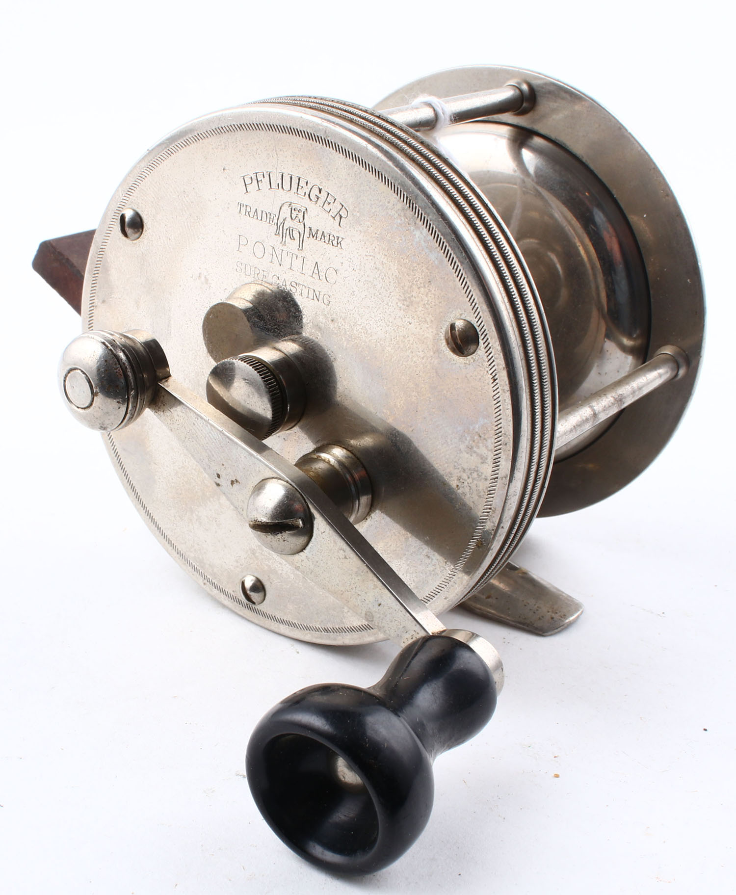 Pflueger Pontiac Surf Casting Reel, 200 yds, single handle, marked on right side plate & bottom of reel seat, strong click, very smooth reel turn. Grade: Excellent + - Value: 10 to 50