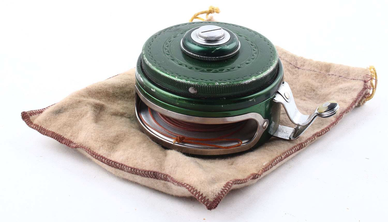 Shakespeare Silent Tru-Art Automatic Fly Reel No. 1835 Model GD, marked on body & bottom plate, wind up & auto reel function properly, comes with cloth pouch. Grade: Very Good ++ - Value: 10 to 50