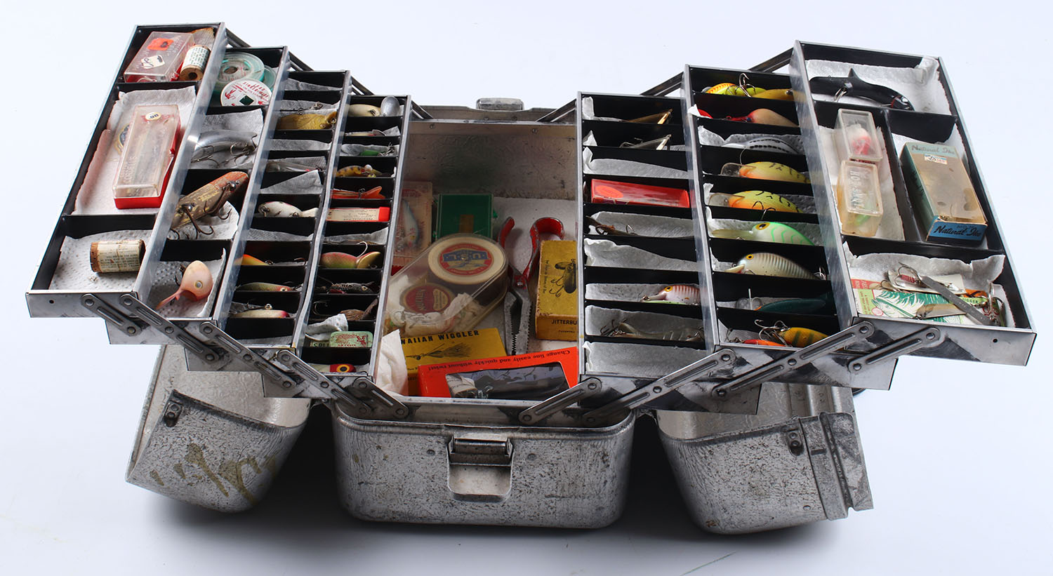 | UMCO Corp. metal tackle box, with an assortment of fishing tackl...