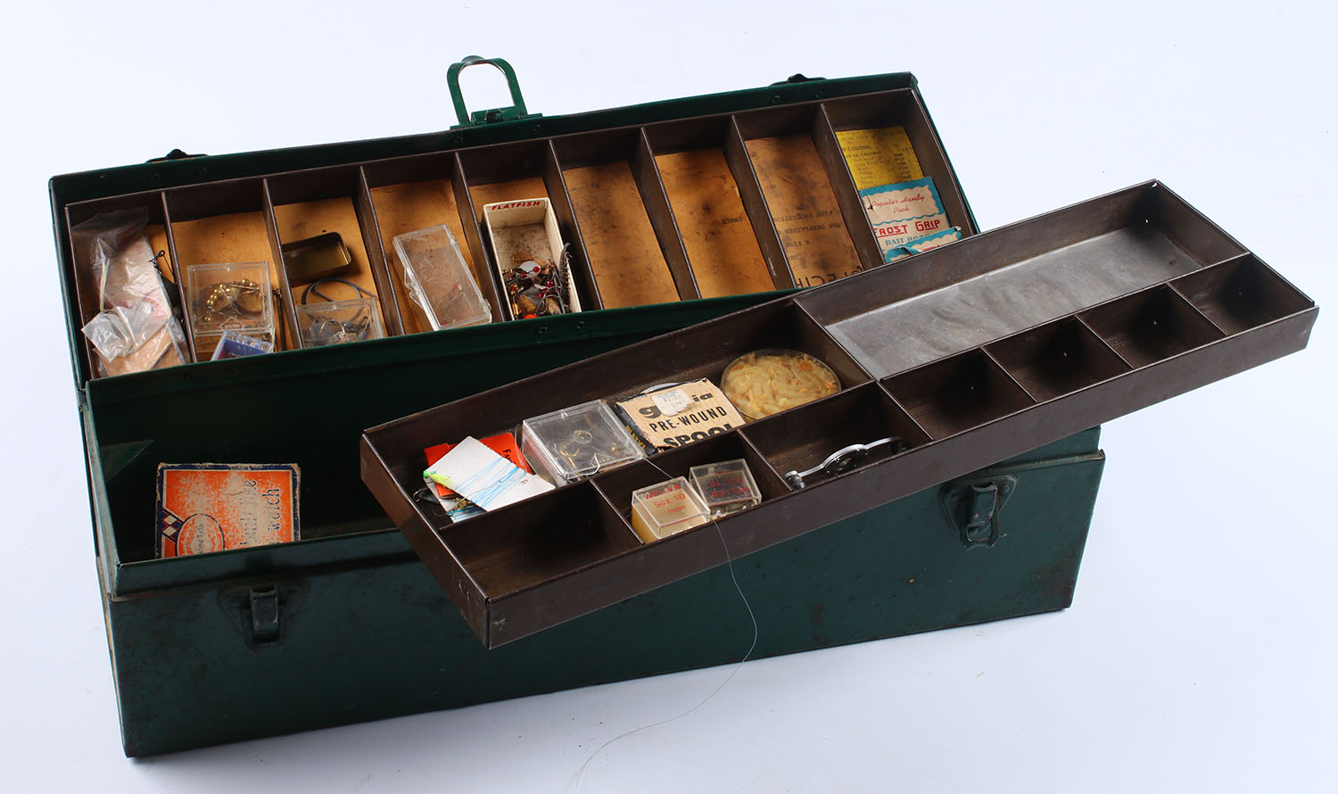 Kennedy, metal tackle box, with an assortment of fishing tackle. Grade: Fair++ - Value: 10 to 50