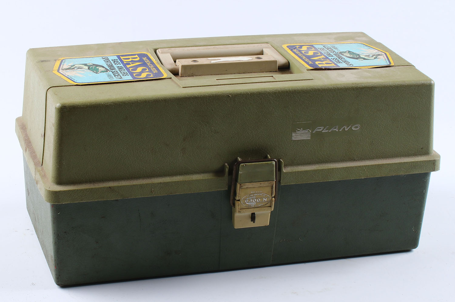 Plano Model 6300 N, plastic tackle box, with an assortment of fishing tackle. Grade: Very Good - Value: 10 to 50