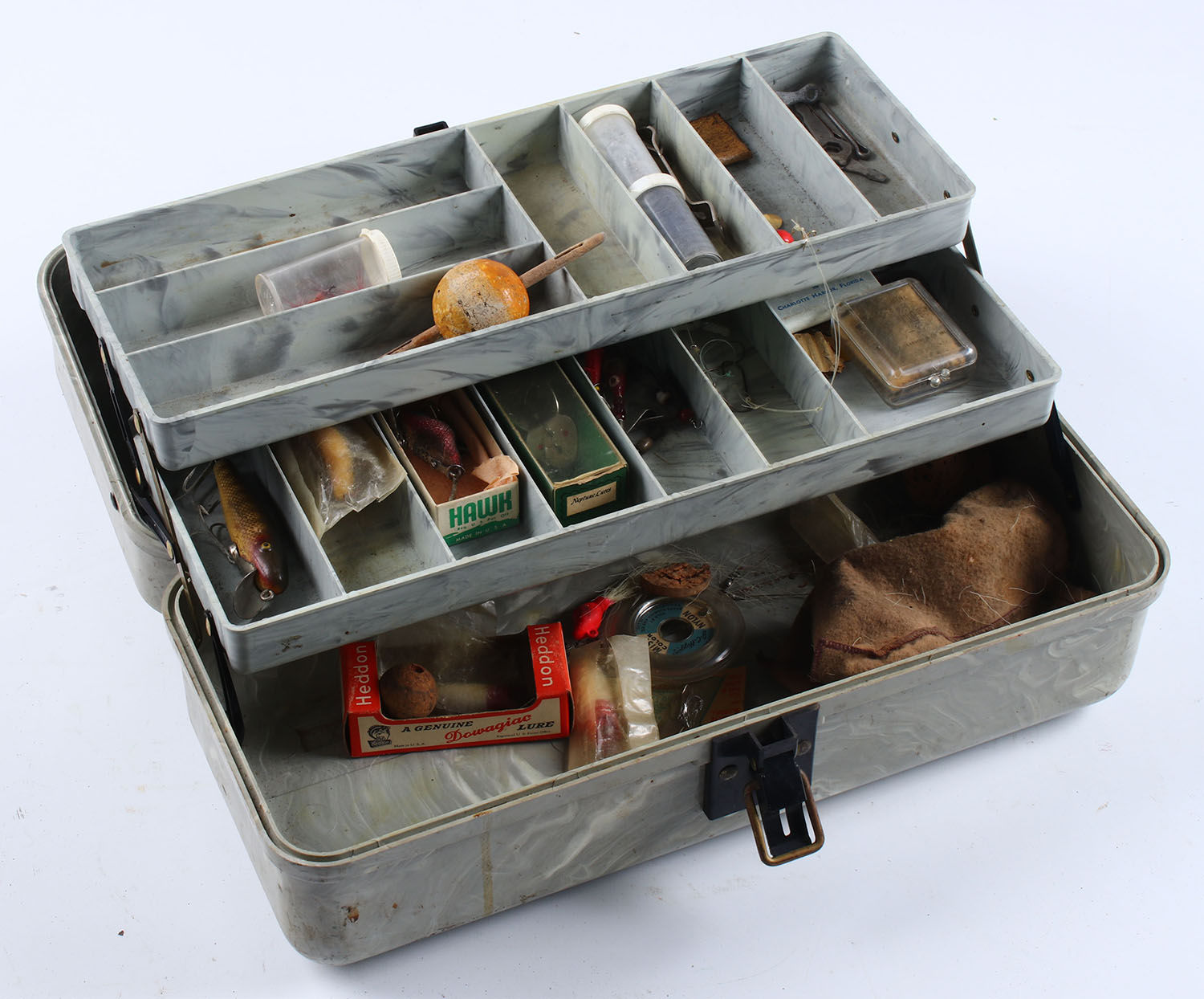 Unmarked, plastic tackle box, with an assortment of fishing tackle. Grade: Very Good - Value: 10 to 50
