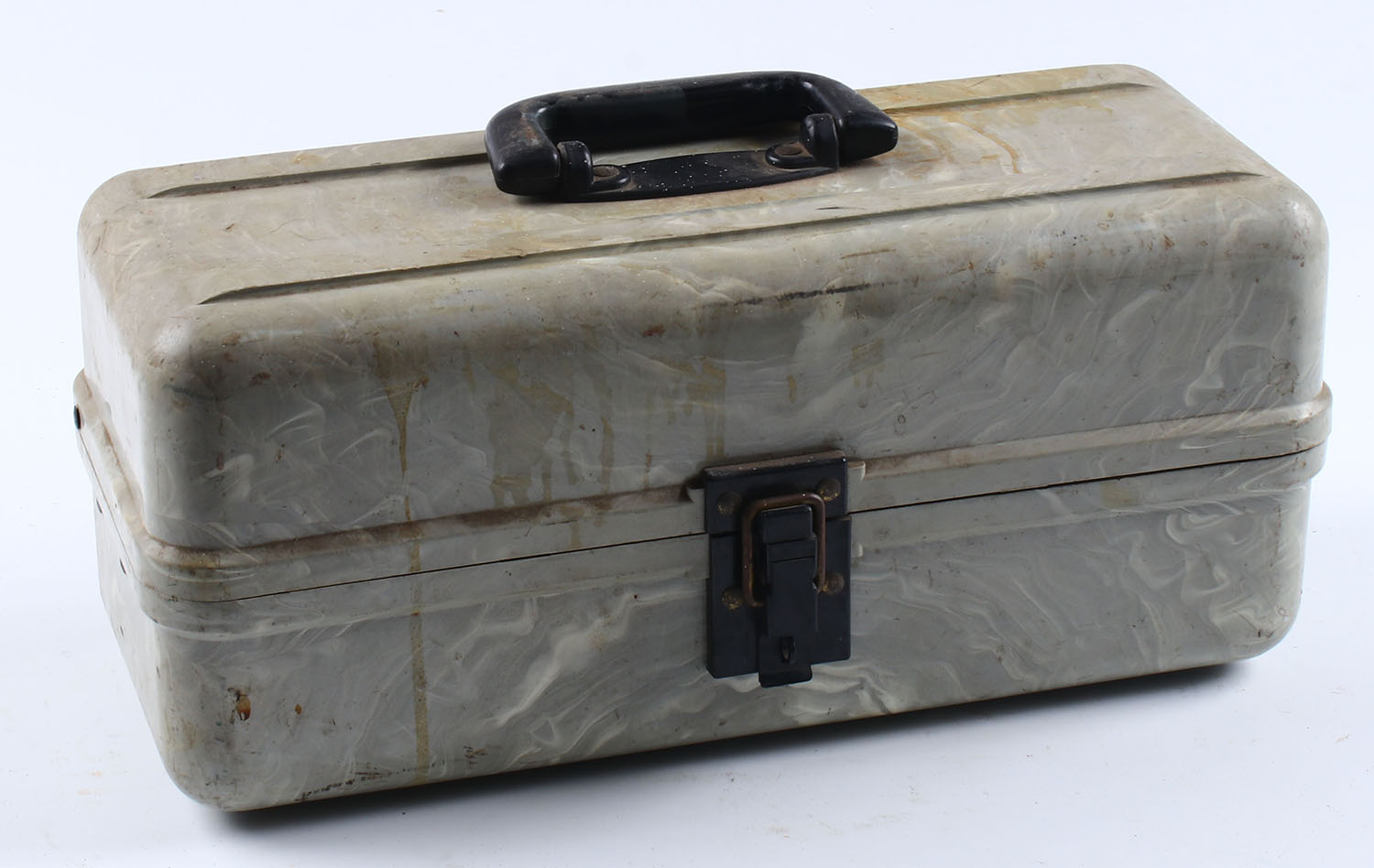| Unmarked, plastic tackle box, with an assortment of fishing tack...