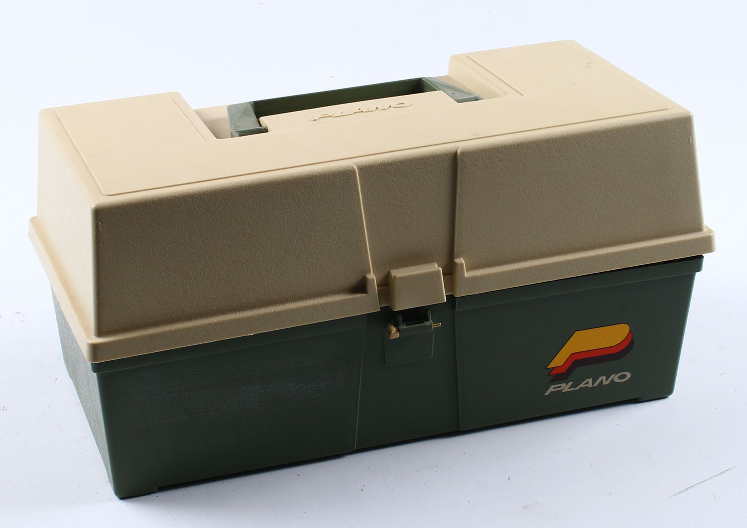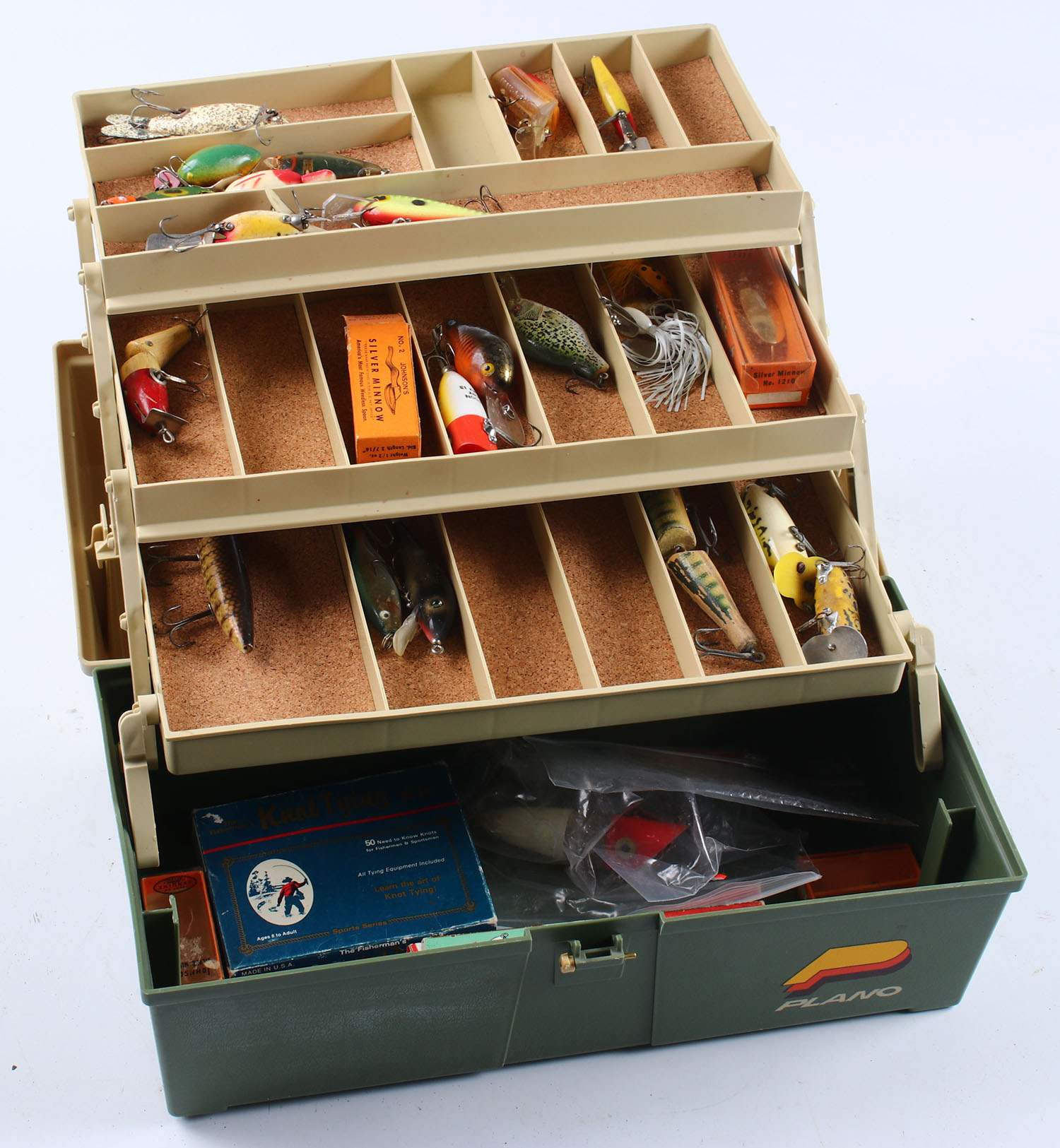 Plano, plastic tackle box, with an assortment of fishing tackle., front latch is broken. Grade: Good - Value: 6 to 30