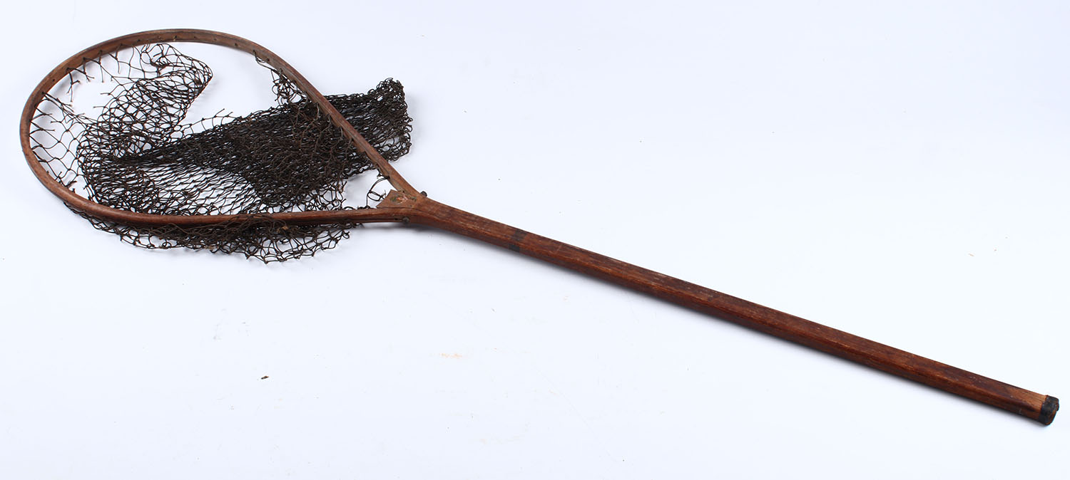 Unmarked, large fishing net, wood handle, solid, has rips in net. Grade: Fair - Value: 4 to 20
