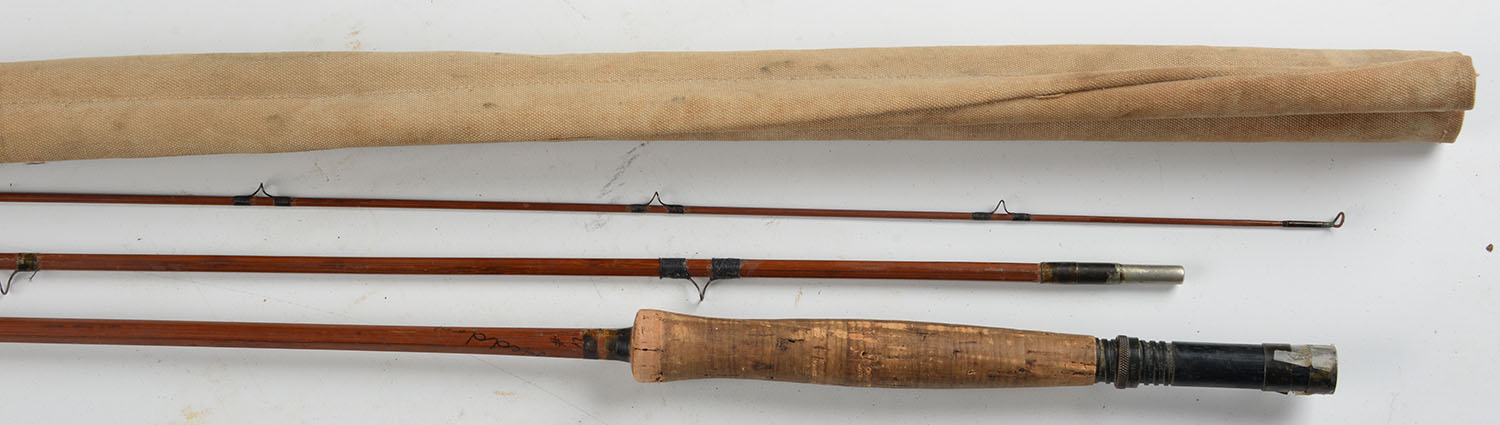 Heddon Bamboo Fly Rod #17, 9'6'', 3/1, red agate eyelets, cork handle has been fished, comes in unmarked canvas carrying case with wood dowel insert, bottom of handle has a small tape repair. Grade: Very Good - Value: 20 to 80