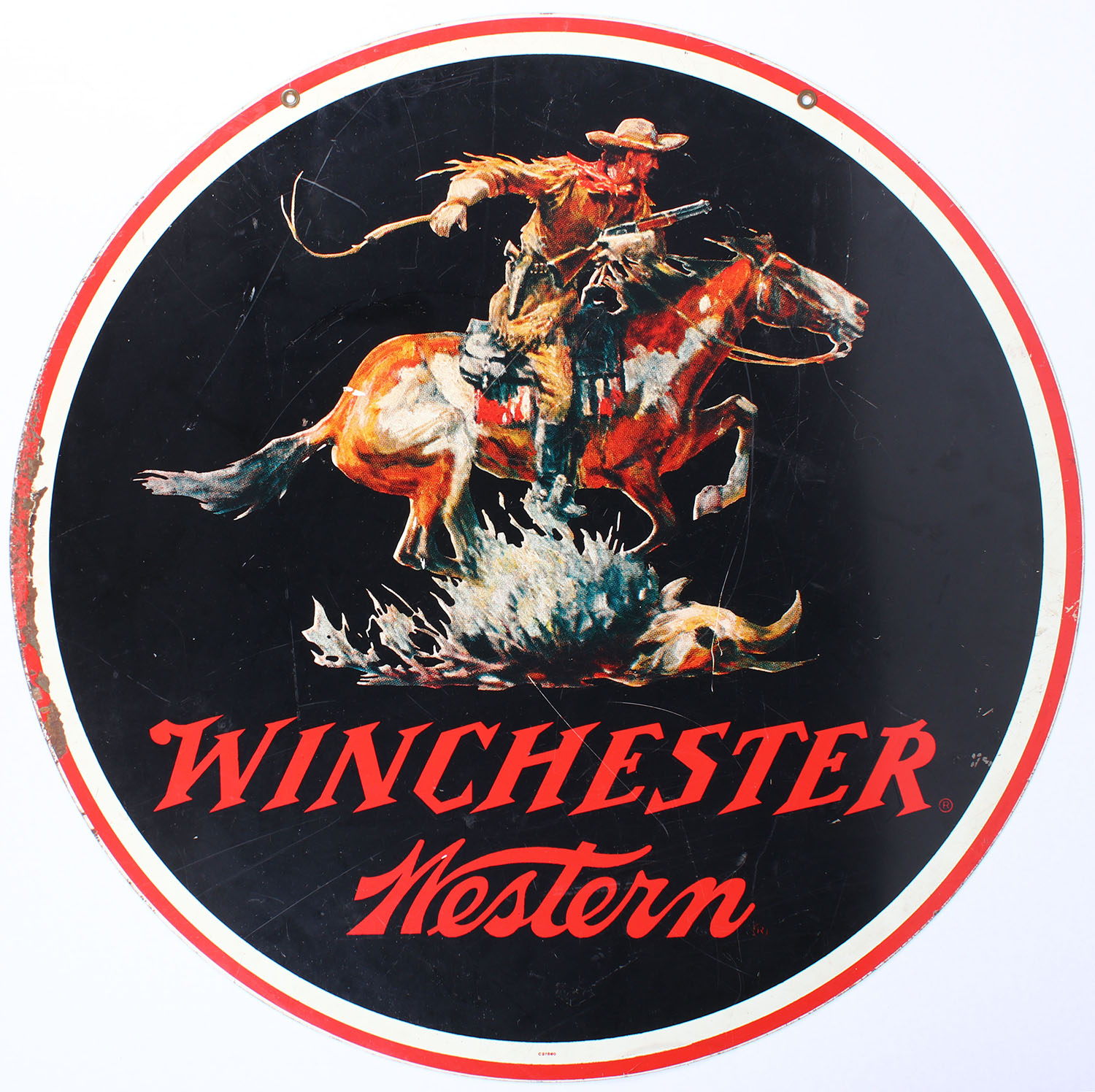 Original 1950's Winchester - Western Double Sided Metal Advertising Sign, red/white/black sign, two metal eyelet hangers, has full color image of horse & rider with brush & buffalo skull underneath, has a couple areas of rust where the paint has chipped off, some small chips, scrapes & edge wear. All in all still has a great appearance & wonderful colors. Large 38'' in diameter.* Grade: Very Good++ - Value: 2000 to 4000