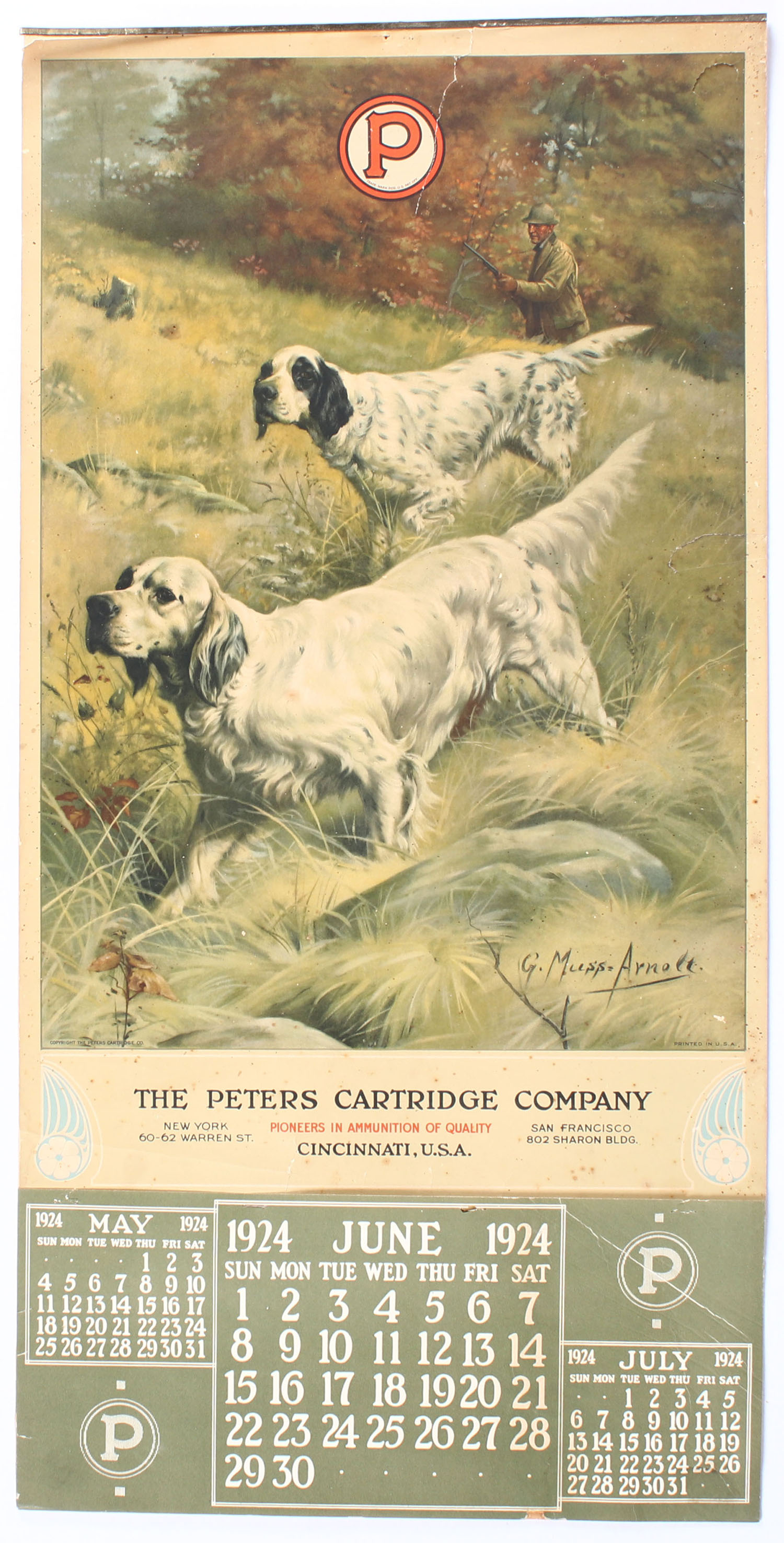 1924 Peters Calendar by G. Muss Arnolt, Pictures two English Setters on point, brass band on top with brass hanger, this one never had a band on the bottom, June page, 15'' x 30'', edges are very good with two tears at the top & right edge, shows age speckling. Grade: Very Good - Value: 500 to 900