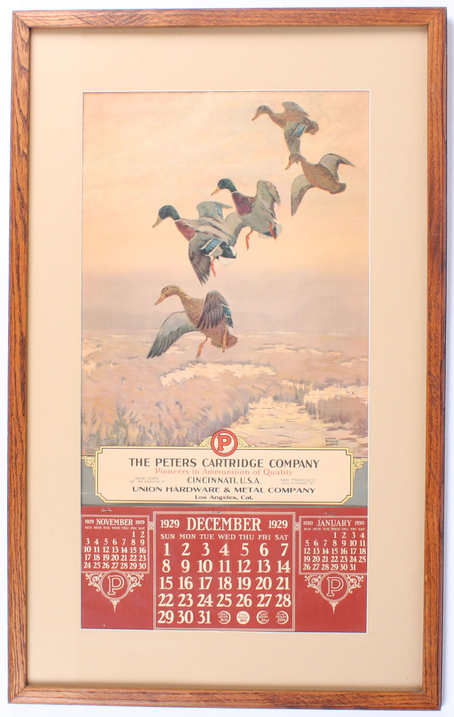 1929 Peters Calendar by Lynn Bogue Hunt, has top band & brass hanger, wonderful full color image of mallards cupping into the marsh below, 15'' x 27 5/8'', has Dec. page, vivid colors, one small tear to bottom left edge, framed. Grade: Excellent - Value: 500 to 2000