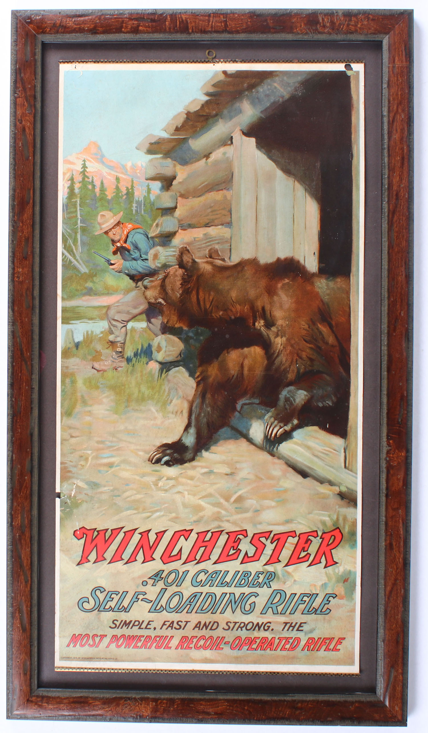 1909 Winchester Poster, ''WINCHESTER .401 CALIBER SELF-LOADING RIFLE'', has great full color image of hunter & grizzly bear meeting at cabin door, 15'' x 30 1/2'', has a tear to left edge, top left corner, top right corner & a small hole 2'' above the ''R'', has wonderful bright colors, metal bands top & bottom with brass hanger, framed. Very attractive piece that is hard to find! Grade: Excellent - Value: 2000 to 4000
