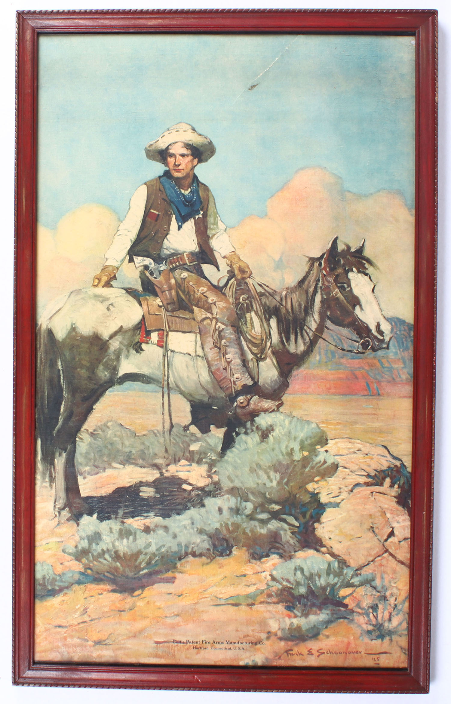 Colt Poster TEX & PATCHES, version #1 by Frank Schoonover, has bands top & bottom, 19 5/8'' x 33 1/4'', has great colors, two tears at the top, framed. Grade: Excellent ++ - Value: 1000 to 3000