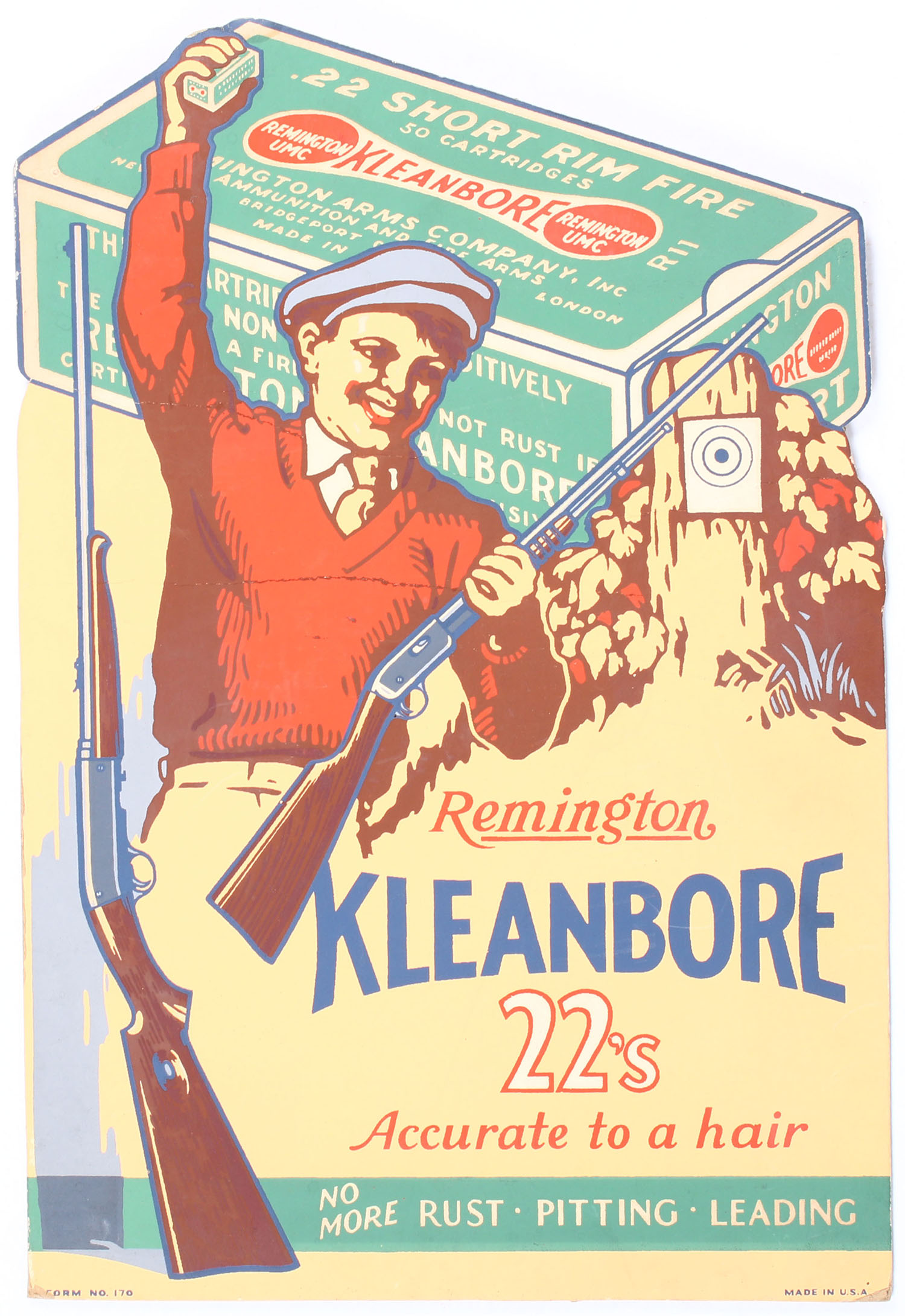 Remington Kleanbore Diecut, pictures a REM-UMC Dogbone box, a boy holding a Model 12 pump & a similar box, a Model 24 on the left side & a target on a stump. Has easel back, 13 1/2'' x 20'', has excellent colors, very minor wear to some corners & edges, a couple creases through the middle. Grade: Excellent + - Value: 300 to 700