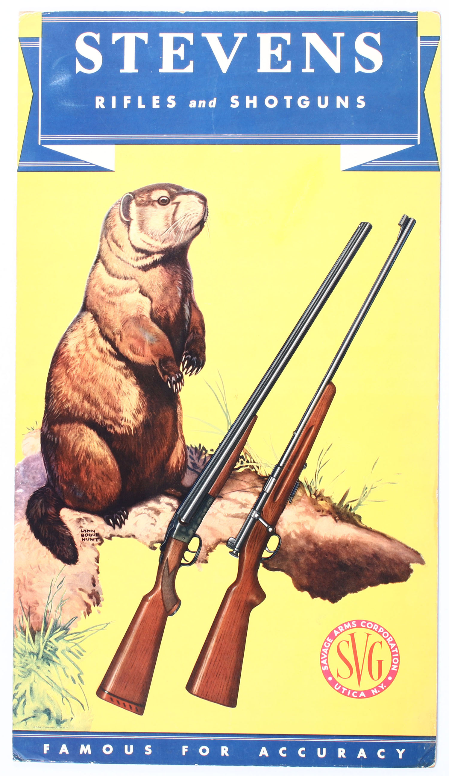 Stevens by Savage Arms Corporation Diecut, pictures a Stevens SxS shotgun, a bolt rifle & a prairie dog. Blue Stevens banner on top & red Savage logo in the bottom right corner. Has easel back, fantastic & vivid colors, only minor corner & edge wear. Grade: Excellent ++ - Value: 300 to 700