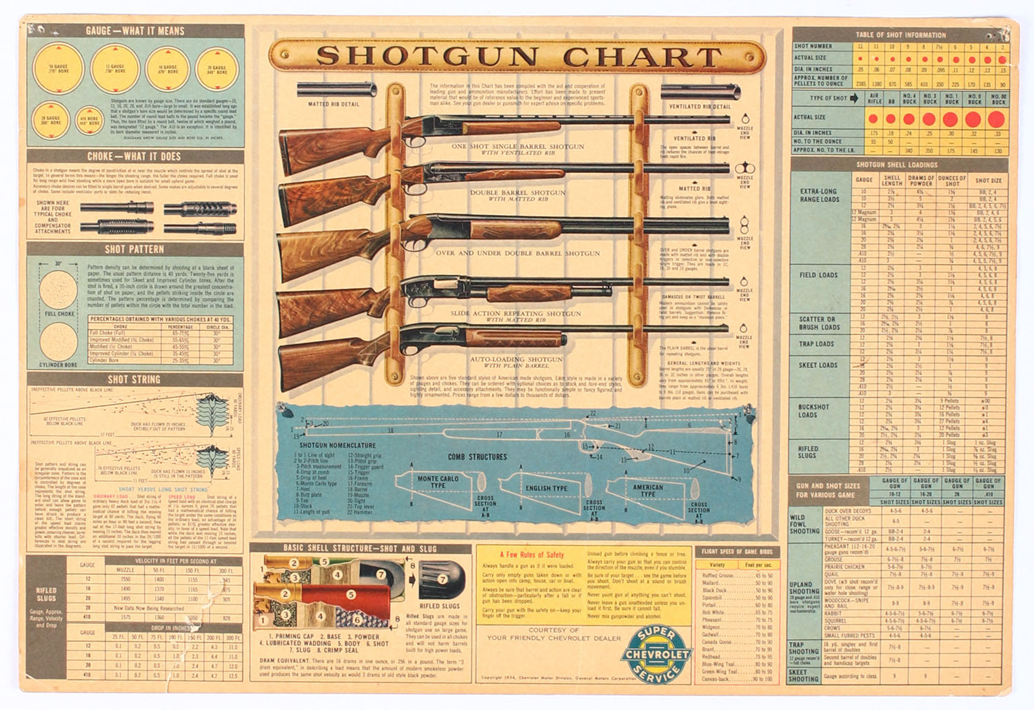 Chevrolet Motor Division Shotgun Chart Diecut, pictures multiple charts with info on shotguns, chokes, shot pattern, load information & more. Issued by Chevrolet in 1954, has tack holes in top corners & a small tear on the bottom left, good colors. Grade: Excellent - Value: 20 to 60