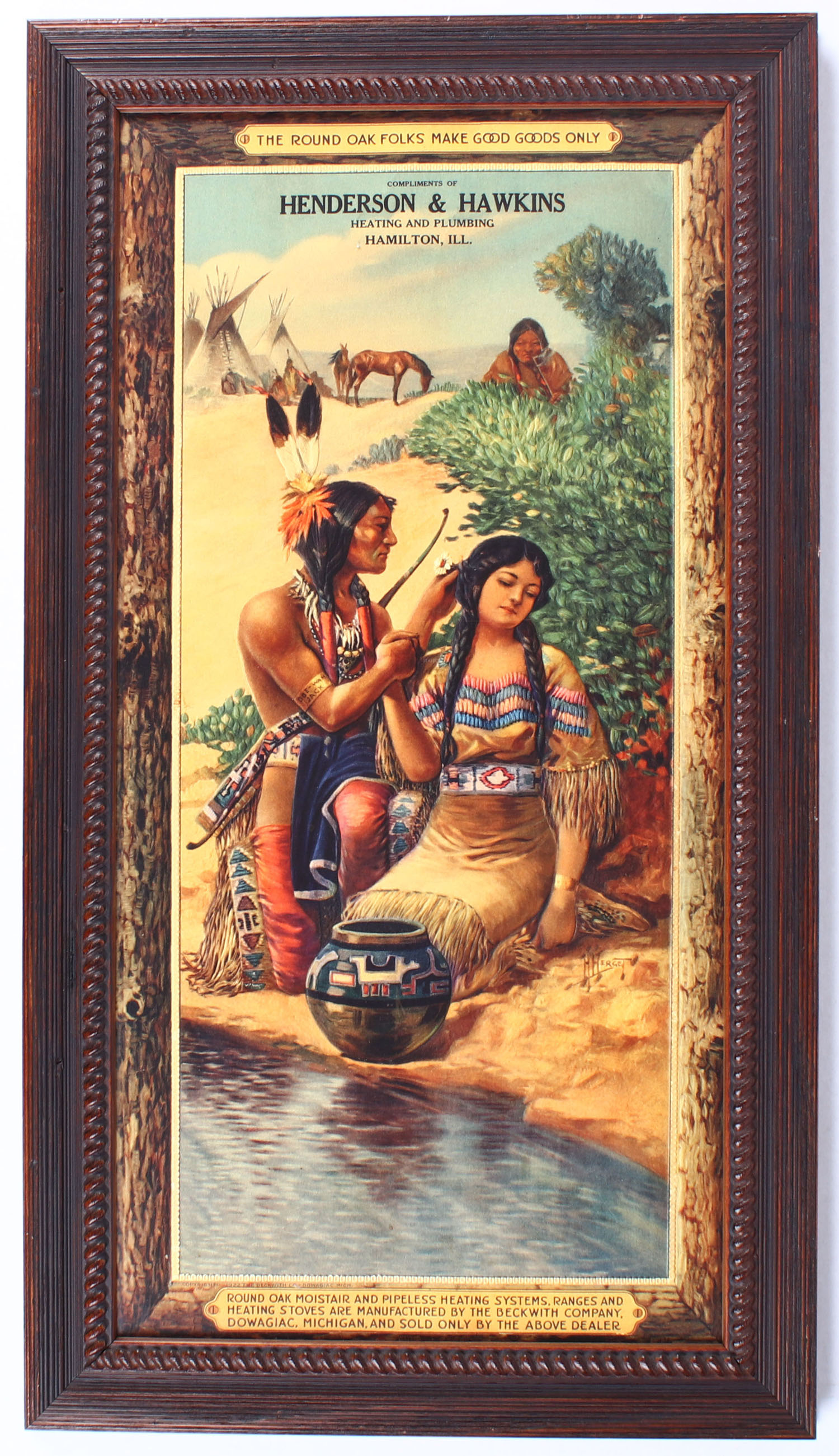 The Beckwith Co. Poster, THE ROUND OAK FOLKS MAKE GOOD GOODS ONLY, compliments of Henderson & Hawkin Heatin & Plumbing, pictures a Native American tribe in a beach setting, with a pair sitting next to the water & sneaky mom or grandma peeking over the bushes, horses & teepee's in the background, has fantastic colors, self framed & framed, no visible damage, 14'' x 28''. Grade: Excellent++ - Value: 40 to 120