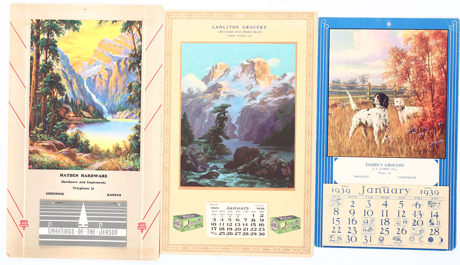 Lot of 3- Store Calendars 1) 1939 Darby's Grocery's, 2) 1926 Langston Grocery, 3) 1939 Hayden Hardware, all have full color images, all have full pad of calendar pages, some minor edge & corner wear to Hayden & Darby pieces. Grade: Excellent - Value: 20 to 100