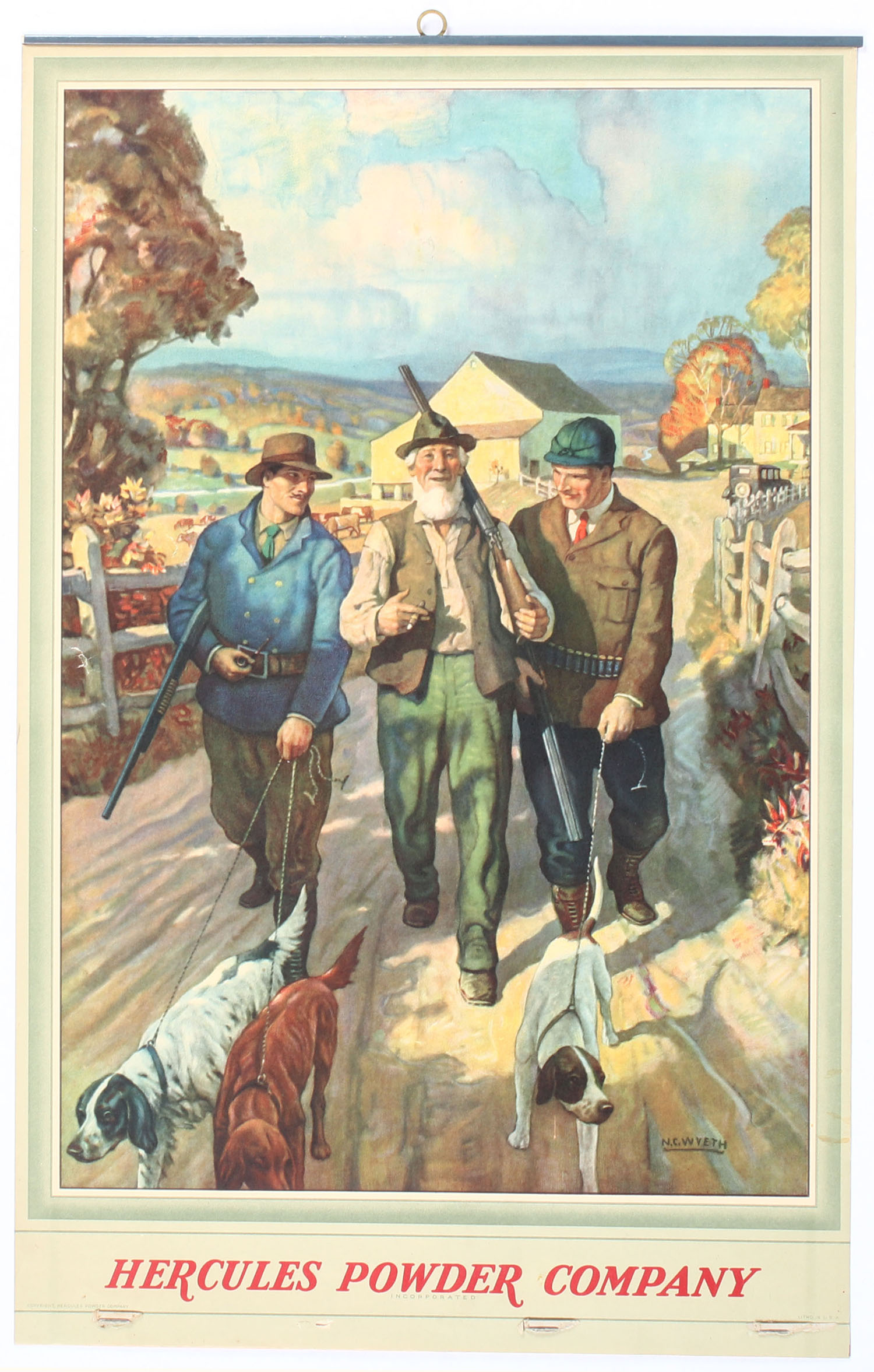Hercules Powder Co. Calendar Top 1933 , pictures a full color image of three men with their hunting dogs leaving town, wonderful colors, top band & brass hanger, missing bottom portion of the calendar, 13'' x 20 1/2''. Grade: Excellent - Value: 50 to 200