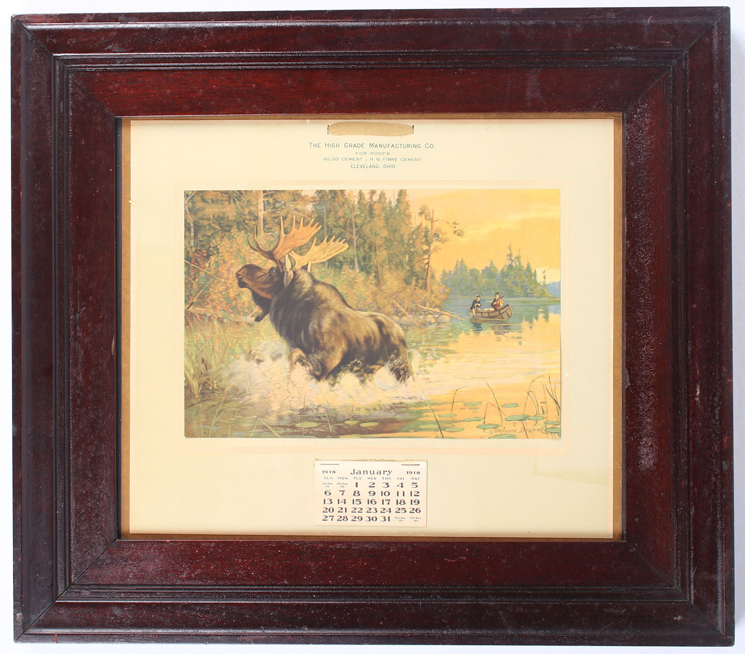 The High Grade Mfg. Co. 1918 Calendar, For Roof's Gilso Cement H.G Fibre Cement, Cleveland, Ohio. Full color image by Belmore Browne, pictures a moose running from two hunters in a canoe, great colors, has multiple calendar pages, light age soiling, framed, 17'' x 15''. Grade: Excellent - Value: 20 to 80