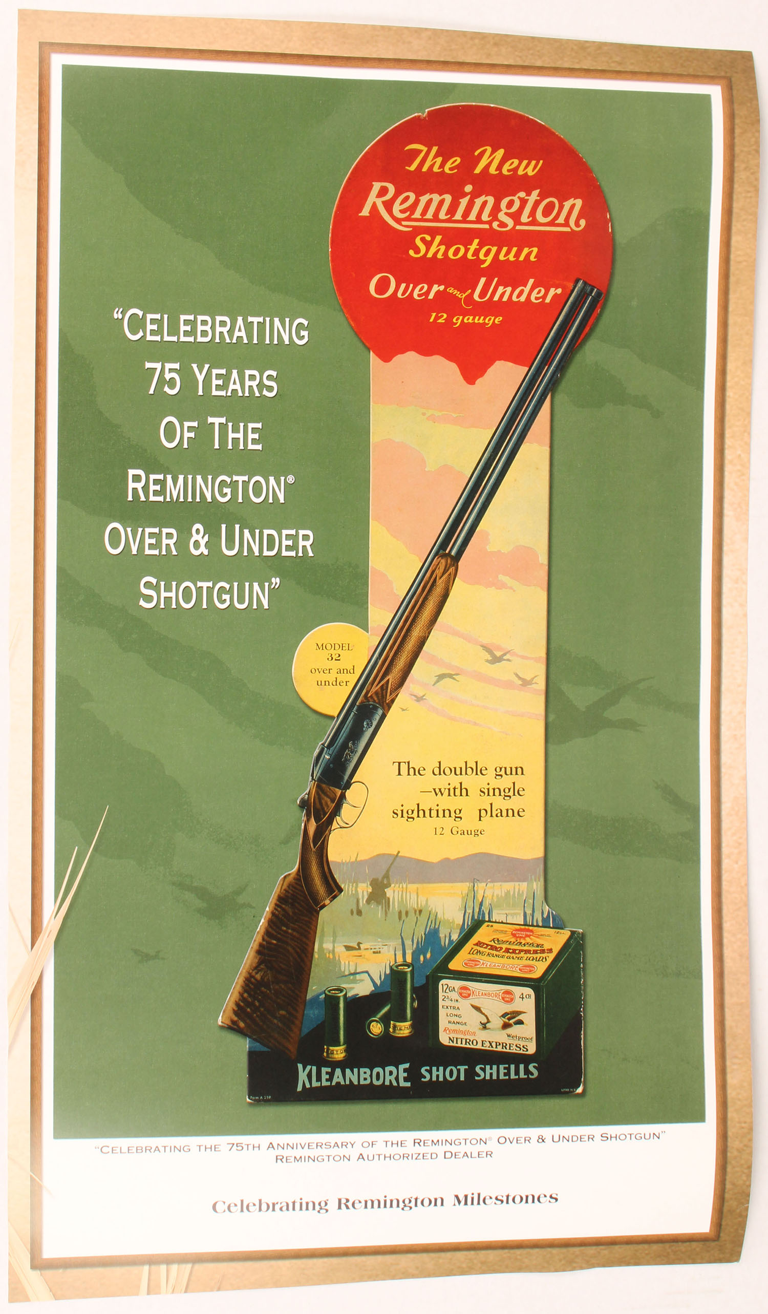 Remington Poster, ''Celebrating 75 years of the Remington Over & Under Shotgun'', features a diecut of the Model 32 O/U Shotgun & box of Kleanbore Nitro Express ammo. Full color image, with fantastic colors. Grade: Excellent ++ - Value: 20 to 80