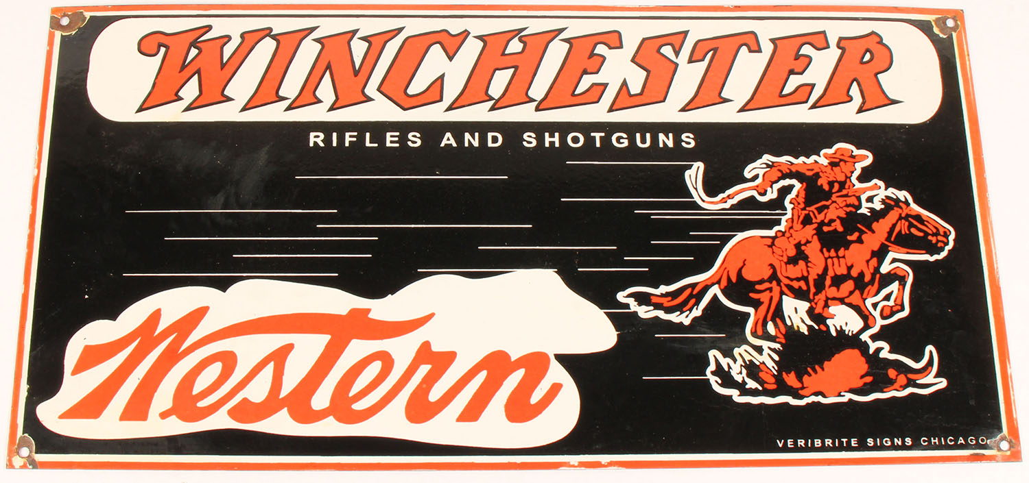 LARGE Winchester-Western Porcelain Metal Sign, ''Rifles and Shotguns'' produced by Veribrite Signs Chicago, Excellent colors, black/red/white sign featuring Winchester horse & rider logo image on the right, one sided, black back, Vibrant colors, only loss of porcelain is minor chipping to the corners around the hanging holes, otherwise excellent. 30'' x 15''. Grade: Excellent - Value: 250 to 500