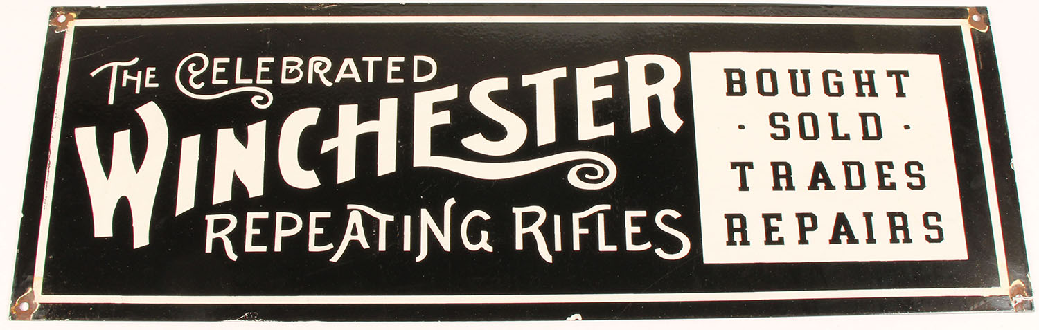 LARGE Winchester Porcelain Metal Sign, ''The Celebrated WINCHESTER Repeating Rifles'', ''Bought Sold Trades Repairs'', black/white sign one sided, black back, Excellent colors, Only porcelain loss to the corners around the holes, otherwise excellent. 36'' x 12''. Grade: Excellent - Value: 250 to 500