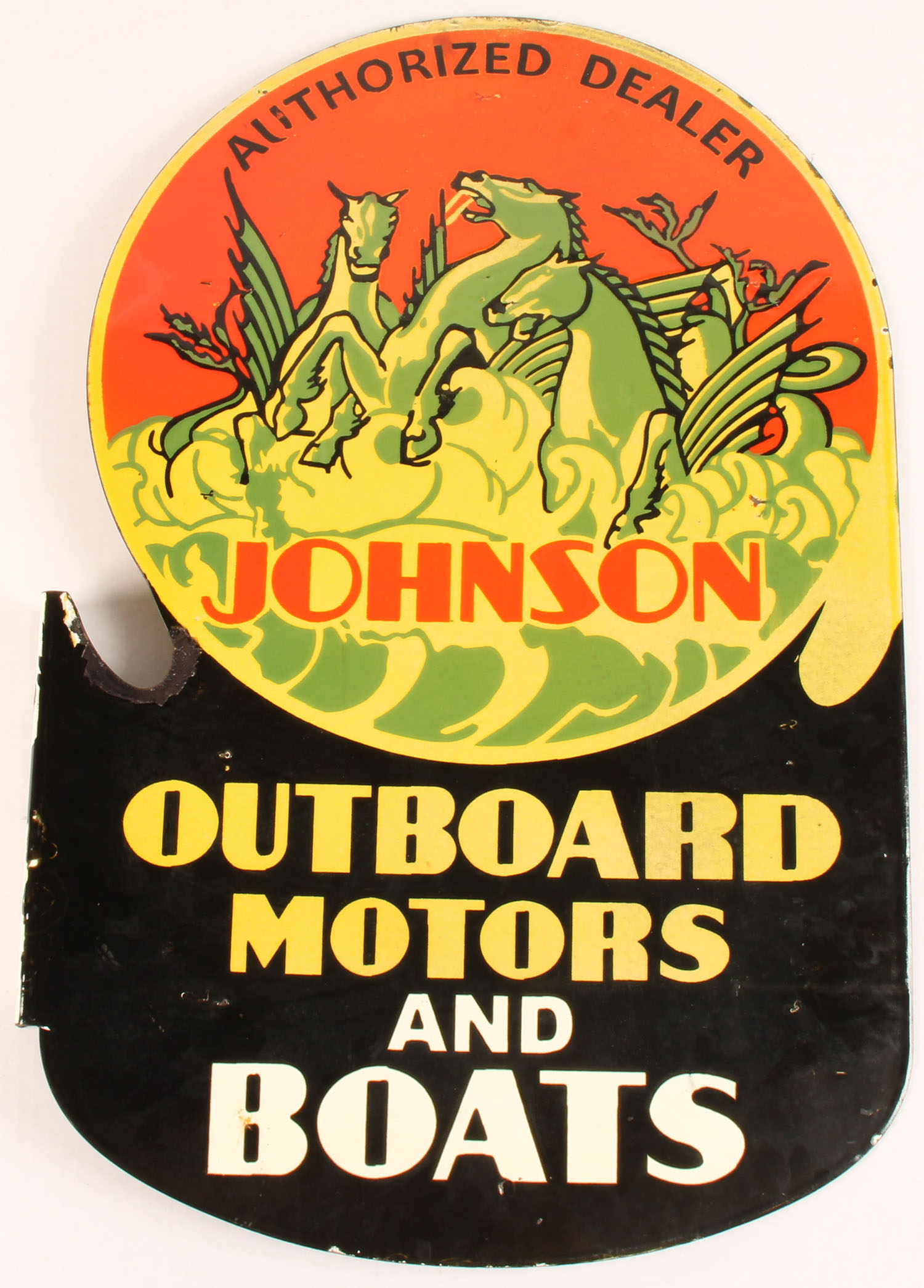 Johnson Outboard Motors & Boats Modern Metal Store Sign, ''Authorized Dealer'', black/yellow/green/orange/white sign, double sided, 90 degree metal flange, image of sea-horses in the clouds, some minor edge wear with paint loss around the hanger holes & ''U'' curve, otherwise excellent. Grade: Excellent - Value: 150 to 450