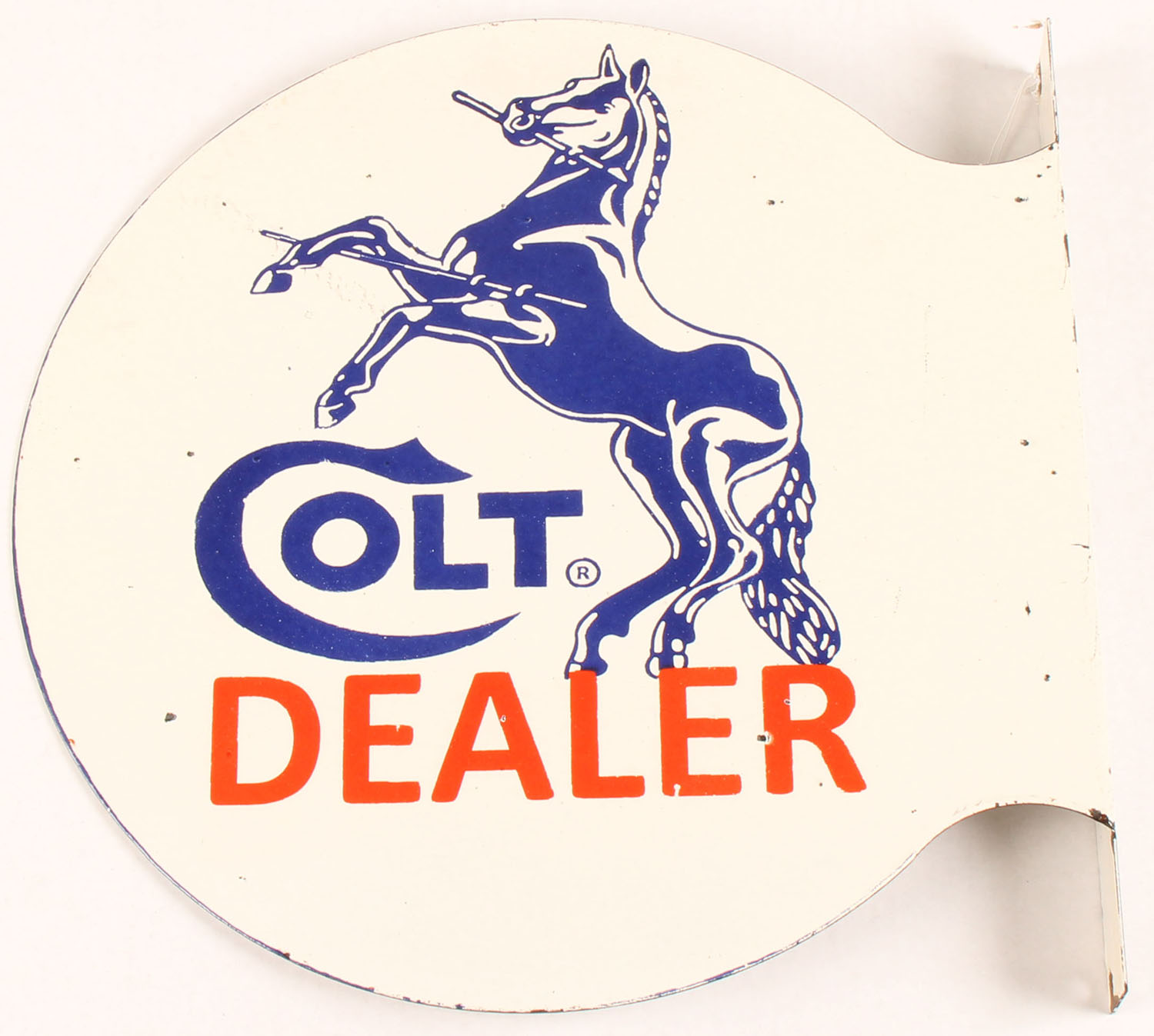 Colt Dealer Porcelain Metal Store Sign, white/blue/red sign, Double sided, 90 degree flange, Features image of Rampant Colt, wonderful colors, a few minor edge chips concentrated to one side, light edge wear & loss around the hanger holes. 17 x 17 1/2''. Grade: Excellent - Value: 300 to 600