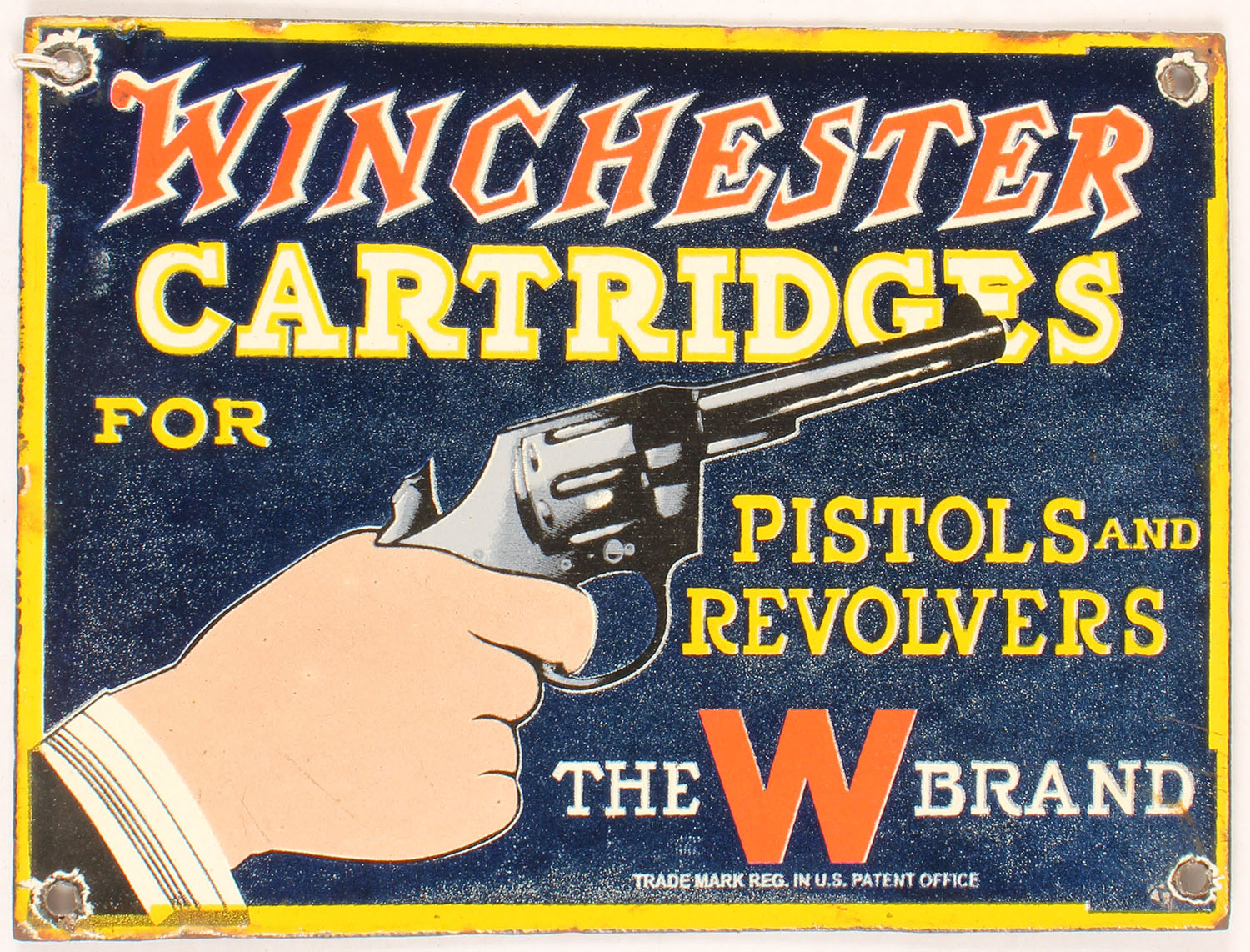 Winchester Porcelain Metal Sign, ''Cartridges for Pistols & Revolvers'', ''The W Brand'', multi-color sign, one sided, black back, Has color image of a hand holding a revolver, Great colors, some speckling & minor edge wear, with some chipping around the hanger holes. 8'' x 6''. Grade: Very Good++ - Value: 100 to 200