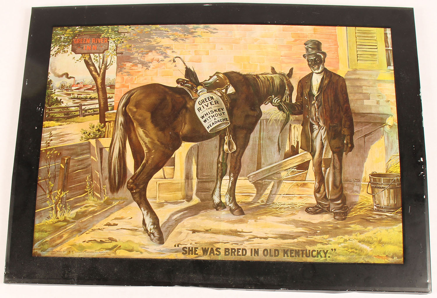 Green River Whiskey Metal Sign, ''SHE WAS BRED IN OLD KENTUCKY'', dated 1899, one sided, white back, full color image of a man with his feeding horse that's carrying a bottle of whiskey, staged on the side of the Green River Inn, fantastic colors, minor paint chips around the edge & a dent on the bottom edge, other side excellent. 17'' x 23''. Grade: Excellent+ - Value: 50 to 150