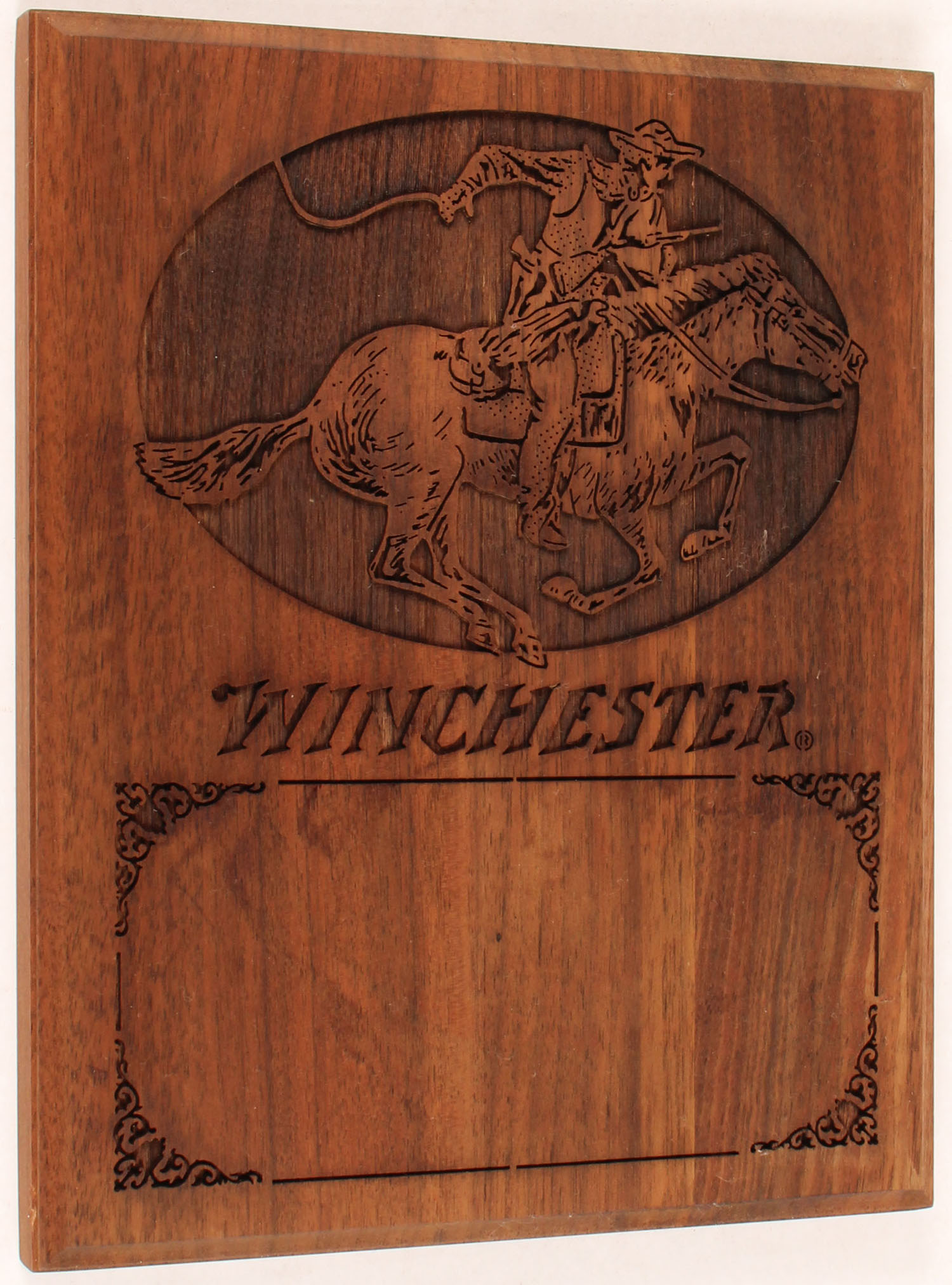 Winchester Wood Plaque, has laser engraved Winchester logo/ image of horse & rider, plus an empty space for a recognition plaque, integral hanger on back. 8'' X10''. Original cost years ago when ordered by WACA, was $100. Grade: Excellent ++ - Value: 40 to 100