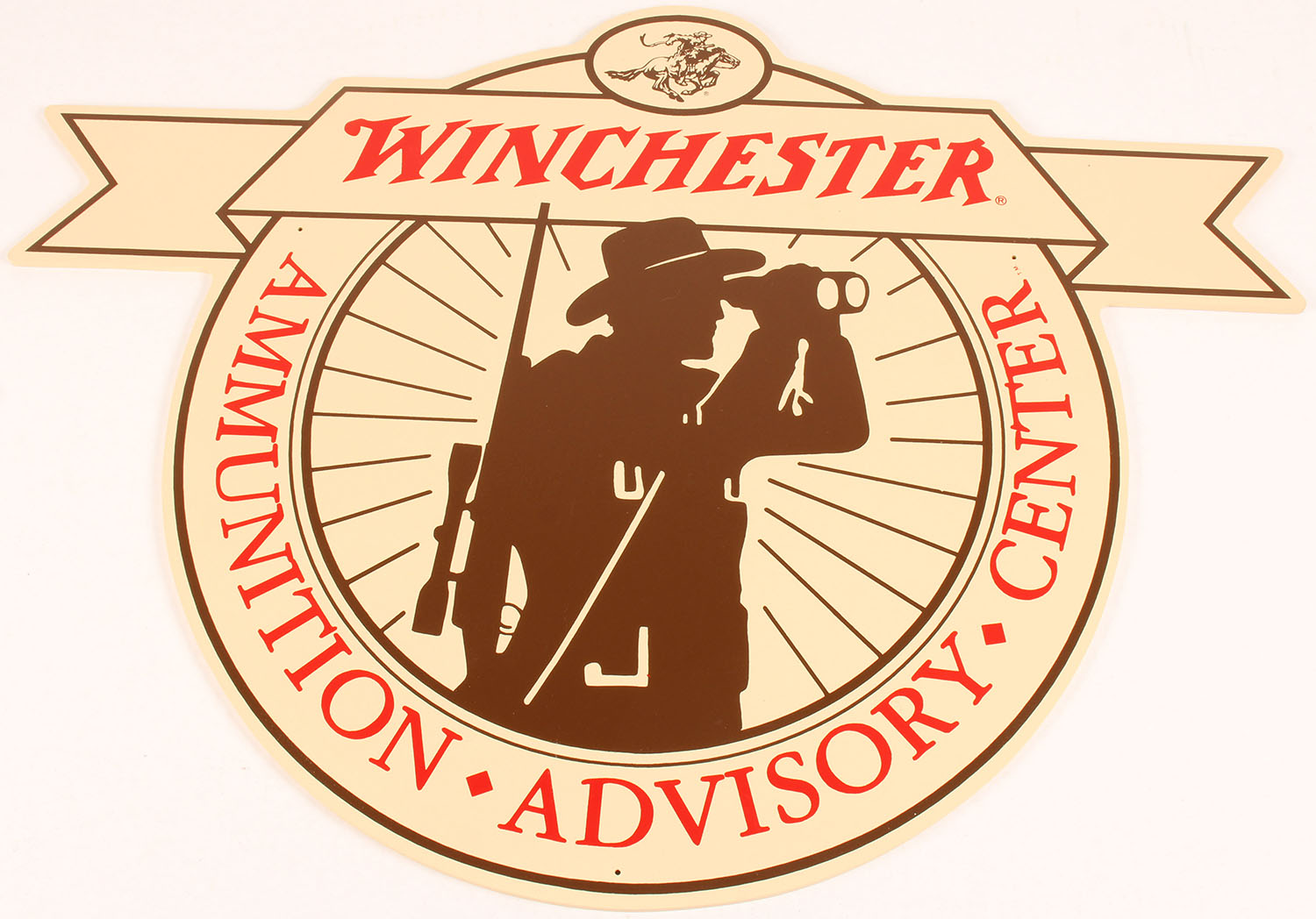 Winchester Ammunition Advisory Center Wood Sign, tan/red/brown sign, one sided, buff back, has silhouette image of hunter looking through binoculars, Winchester horse & rider above wording, comes in factory shipping box, excellent overall. Grade: Excellent ++ - Value: 50 to 200