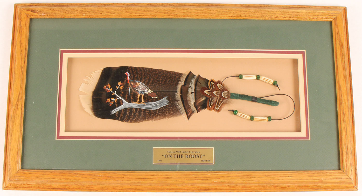 NWTF ''ON THE ROOST'', 200, #1104/1900, image by Bette & Dave Edgerton, inside the frame is a turkey tail feather with a painting of a Merriam turkey on it, has green/tan beads on a black string, framed, 24 1/2'' x 13 1/2''. Grade: Excellent - Value: 20 to 200