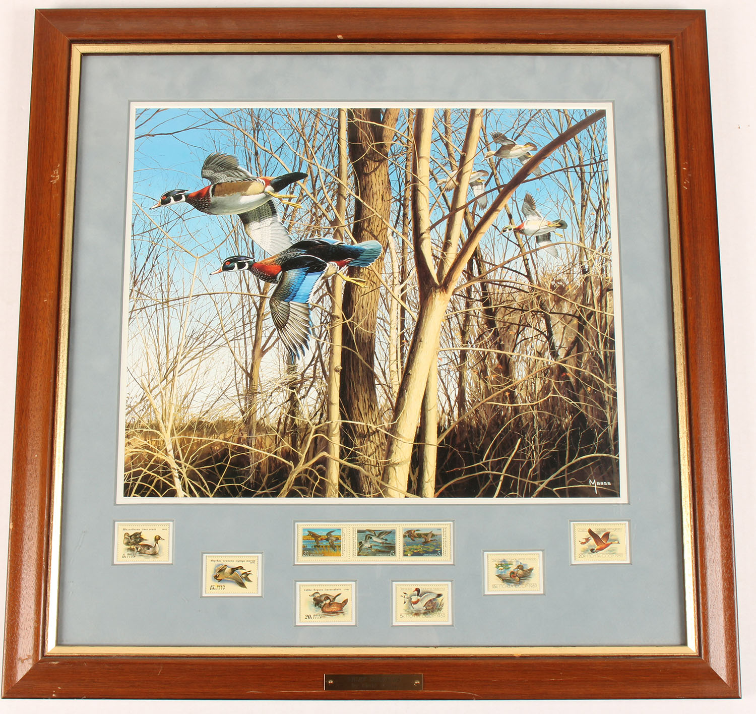 David Maass ''TIGHT QUARTERS'', dated 1992, pictures a full color image of wood ducks flying through timber, below the print are (9) duck stamps (3) from each year ,1989, 1990, 199, writing on stamps appears to be Russian, framed, 23'' x 23''. Grade: Excellent - Value: 20 to 80