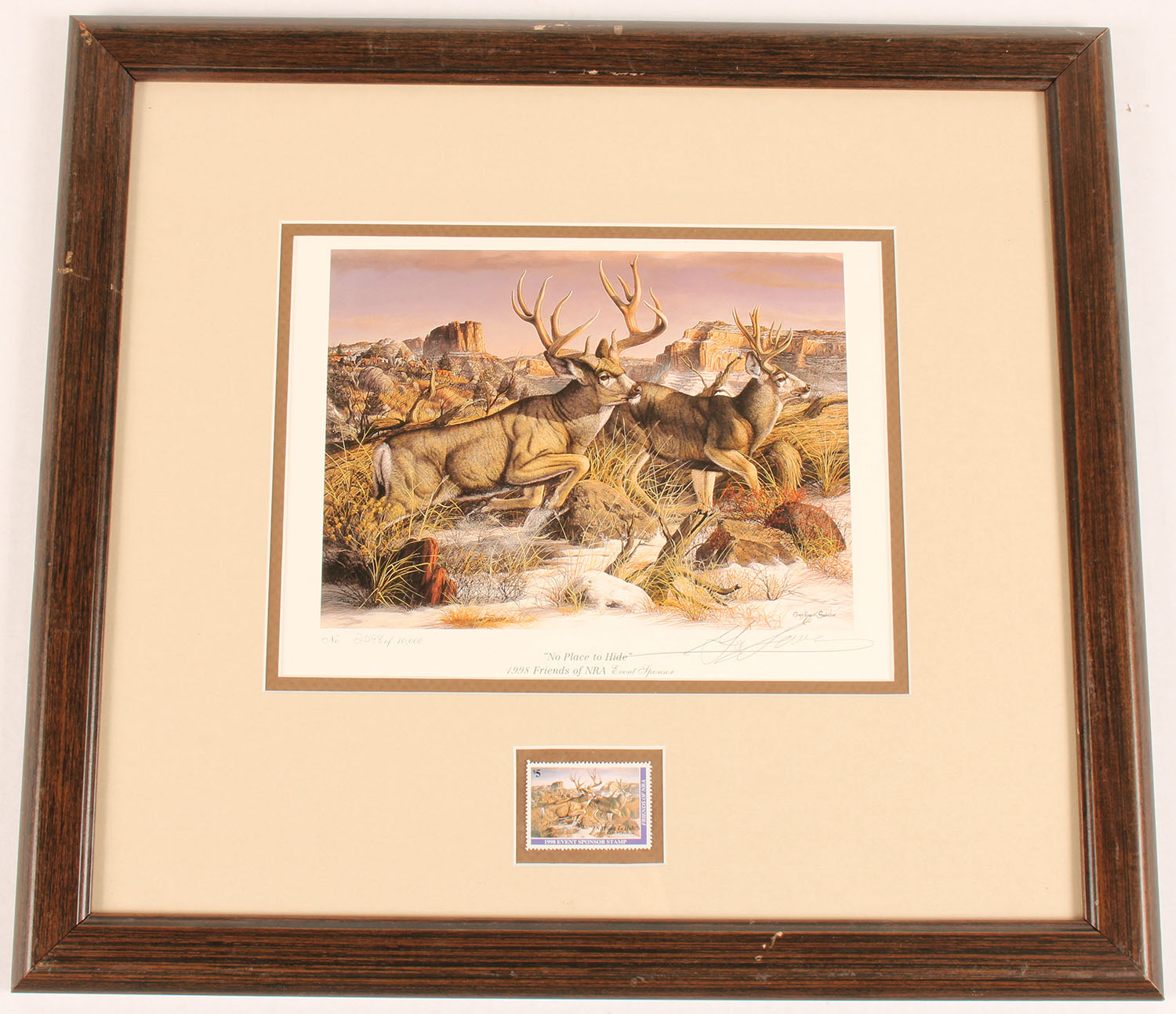 Gary Robert Swanson ''NO PLACE TO HIDE'', 1998 Friends of NRA Event Sponsor, #2098/10,000, signed, full color image of two buck deer, has 1999 event sponsor stamp below, framed, 18'' x 16 1/2''. Grade: Excellent - Value: 20 to 80